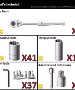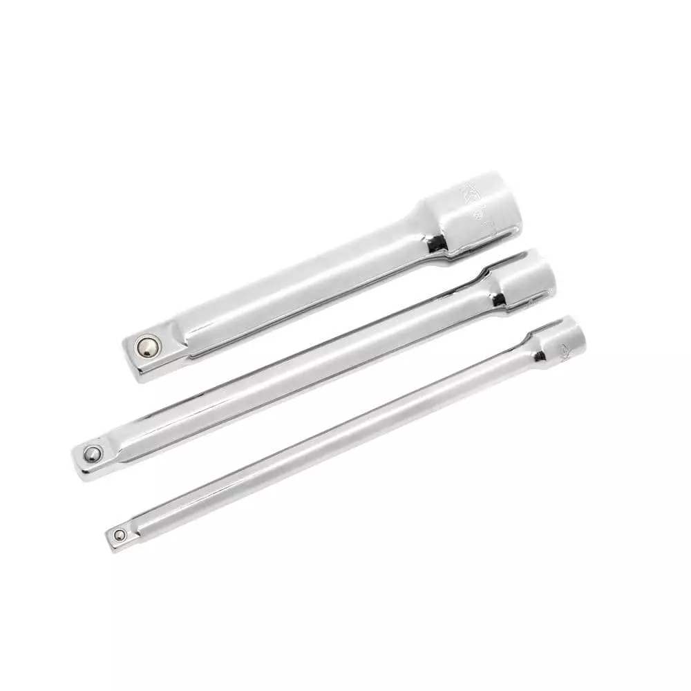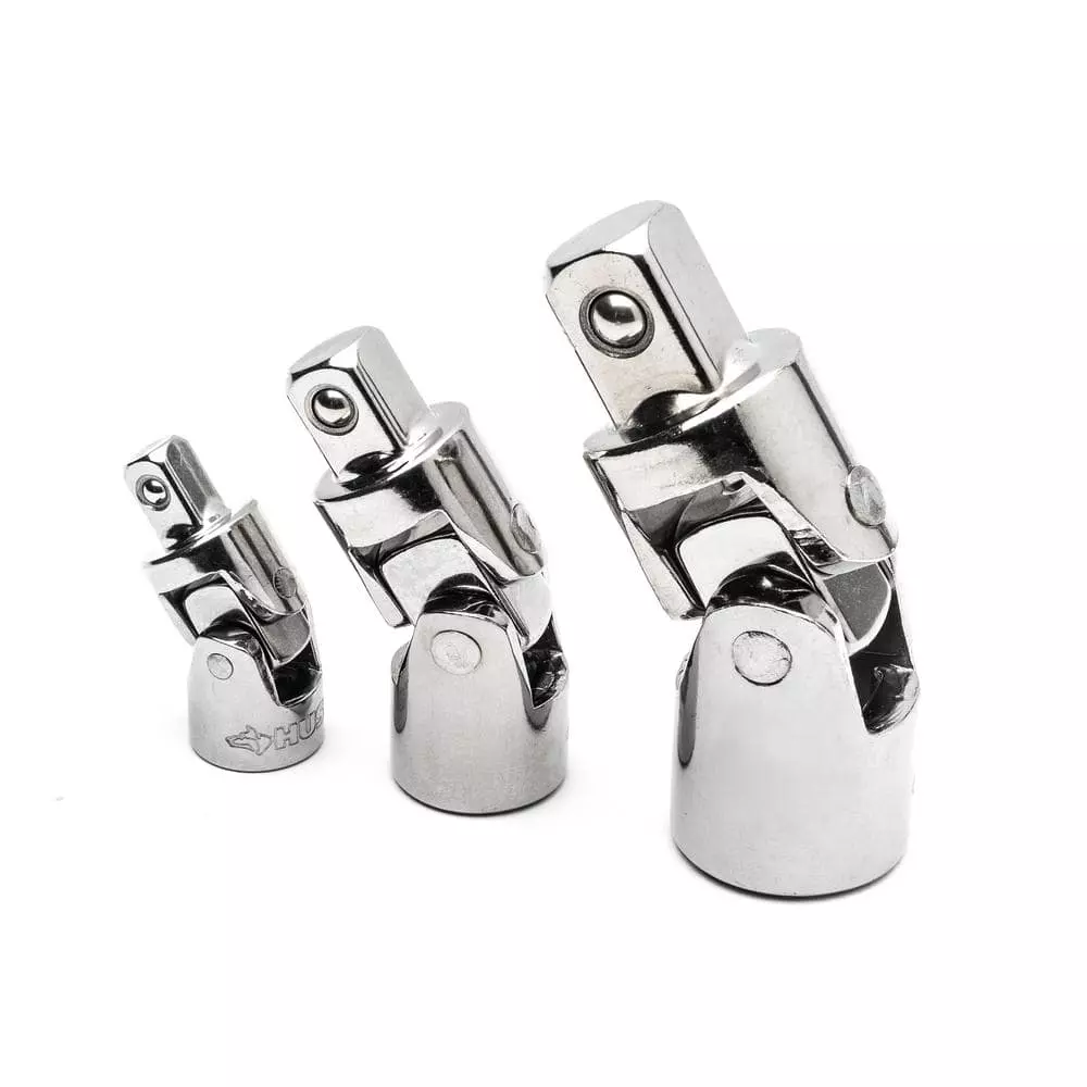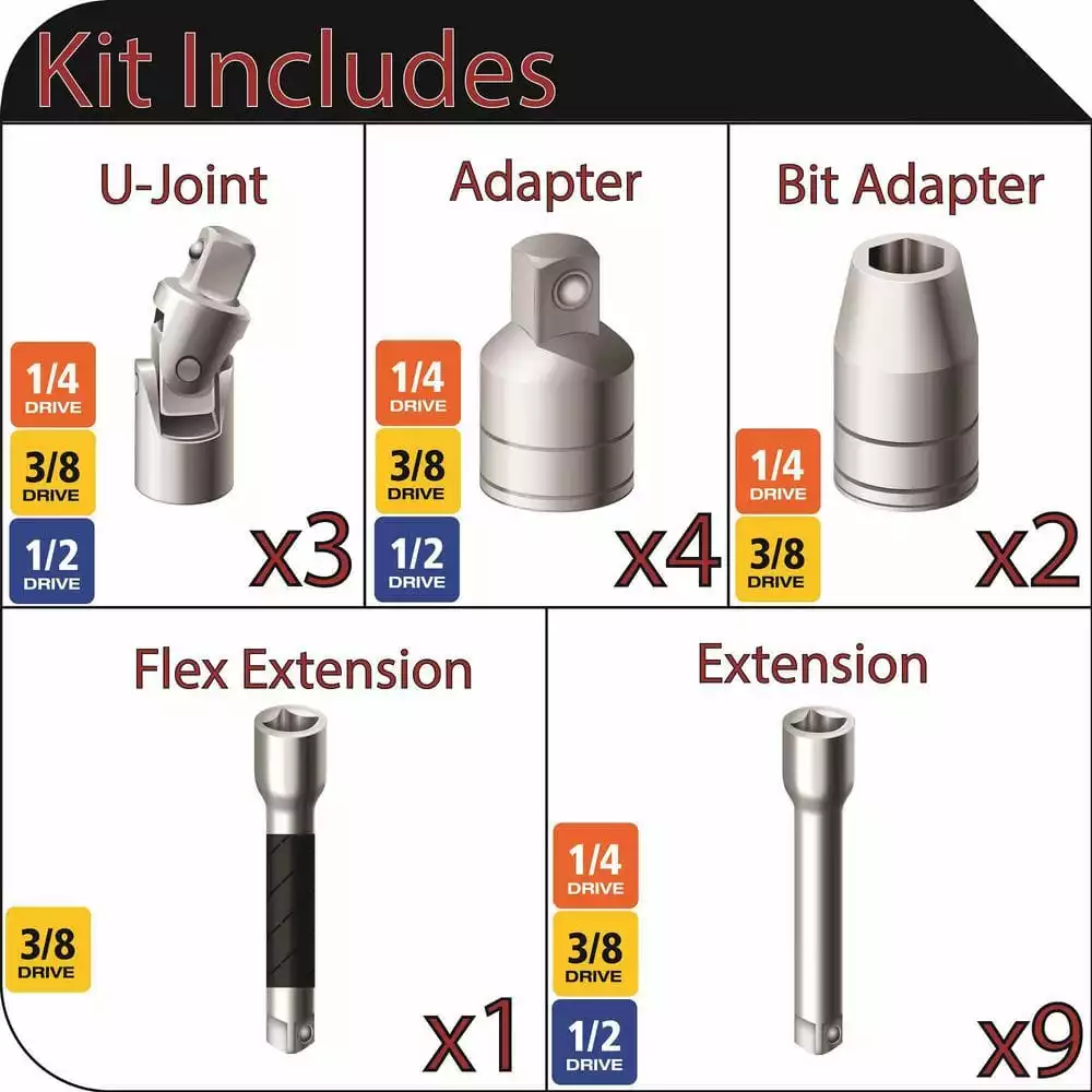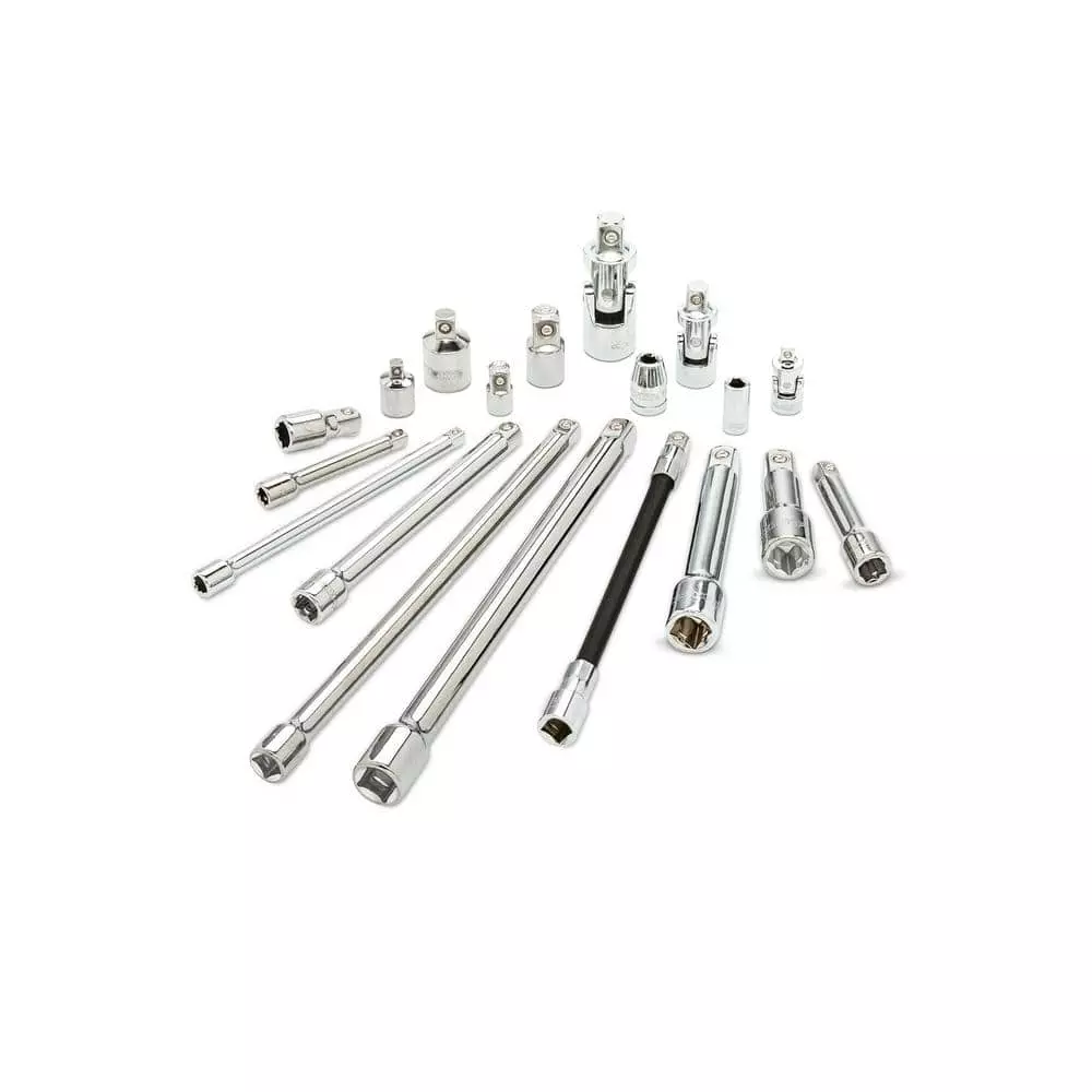 The Husky 19-piece complete Accessory Set includes a variety of extensions, adapters and universal joints that are made from alloy steel for strength and long-lasting performance. The finish provides resistance to corrosion. The chamfered lead-in on both ends allows for quick and easy attachment to the drive tools and sockets. Set includes: 9 standard extensions- 1/4 in. drive (3, 6 in.) 3/8 in. drive ( 1-1/2, 3, 6, 10 in.) 1/2 in. drive ( 3 in., 5 in., 10 in.), one 3/8 in. drive 8 in. flex extension, 4 drive adapters (1/4F to 3/8M, 3/8F to 1/4M, 3/8F to 1/2M and 1/2F to 3/8M), 3 universal joints (1/4, 3/8, 1/2 in.) and 2 bit adapter sockets (1/4 in. and 3/8 in. drive).