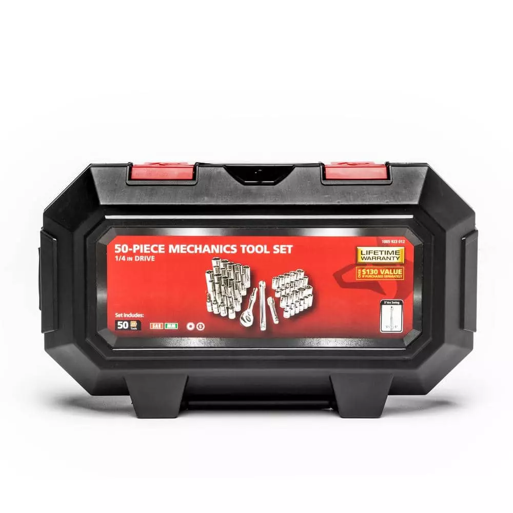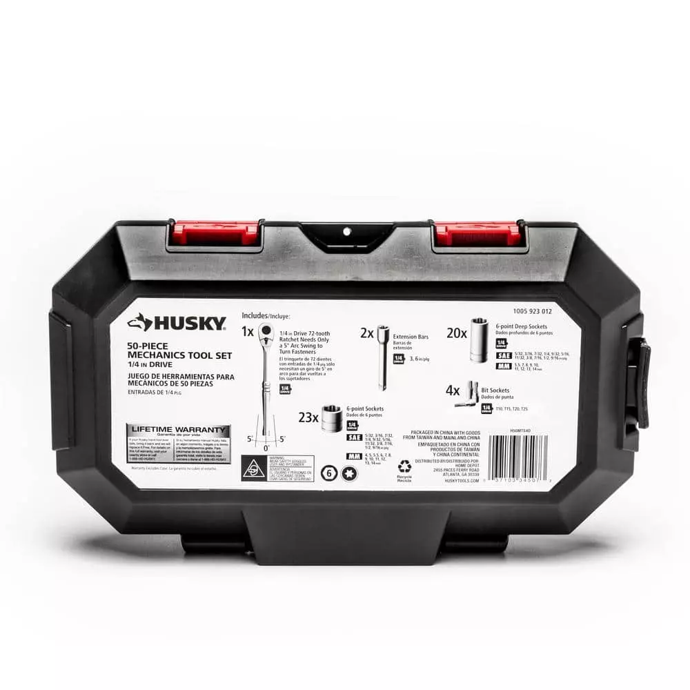 The Husky 50-piece 1/4 in. Drive SAE/Metric Socket Set is forged from Chrome Alloy steel for outstanding durability and strength. The 43 different sockets and 4 bit sockets will allow you to tackle a wide range of basic fastening or repair projects. This Husky 50-piece set is ideal for any garage or your home workshop.