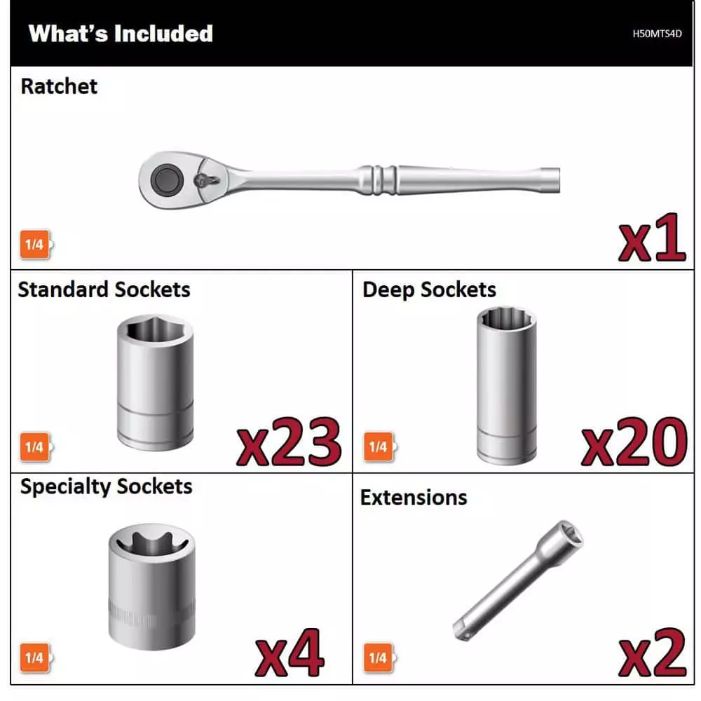 - Set includes one 1/4 in. drive ratchet, one 3 in. extension bar, one 6 in. extension bar, forty-three 1/4 in. drive 6-point sockets: SAE shallow and deep 5/32 in., 3/16 in., 7/32 in., 1/4 in., 9/32 in., 5/16 in., 11/32 in., 3/8 in., 7/16 in., 1/2 in., 9/16 in., metric shallow 4 mm, 5 mm, 5.5 mm, 6 mm, 7 mm, 8 mm, 9 mm, 10 mm, 11mm, 12 mm, 13 mm, 14 mm and deep 5.5mm, 7mm, 8mm, 9mm, 10mm, 11mm, 12mm, 13mm, 14mm; and 4 bit sockets T10, T15, T20 and T25