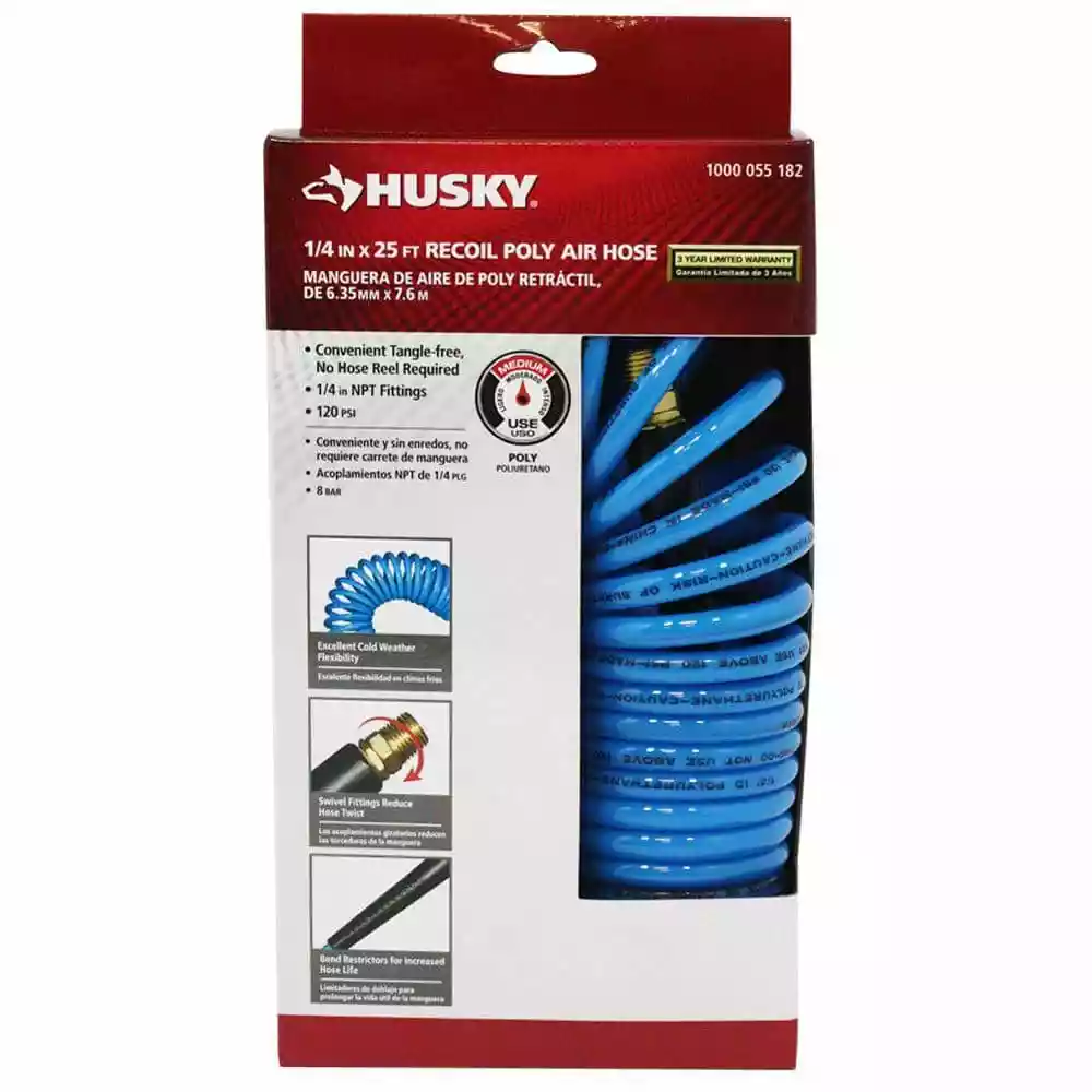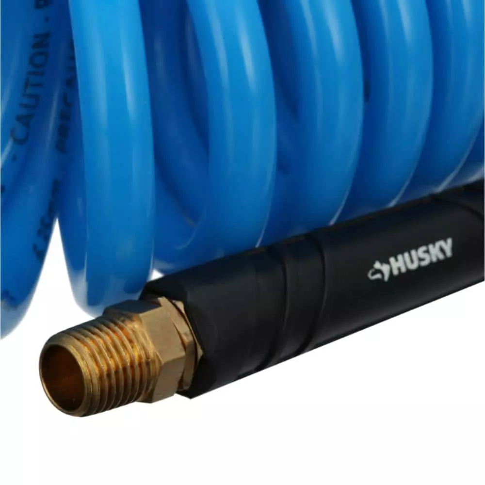 Polyurethane Recoil Hose retains its self-coiling properties and stores itself when finished. Can be used with all air-powered equipment on the job site and in garages, plants and service stations. It features swivel fittings to reduce twist. Bend restrictors reduce kinking and increase the life of the hose. The soft polyurethane finish is less likely to scratch surfaces.