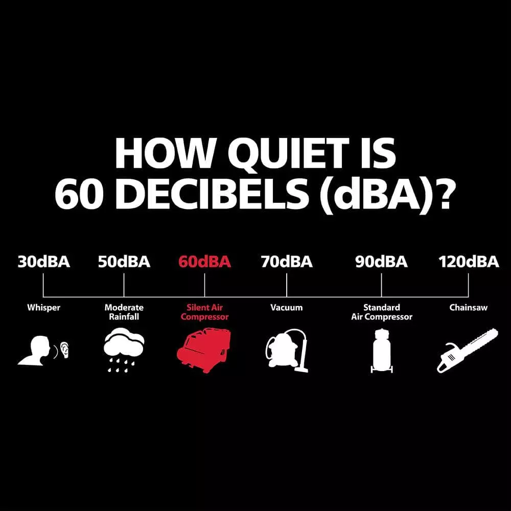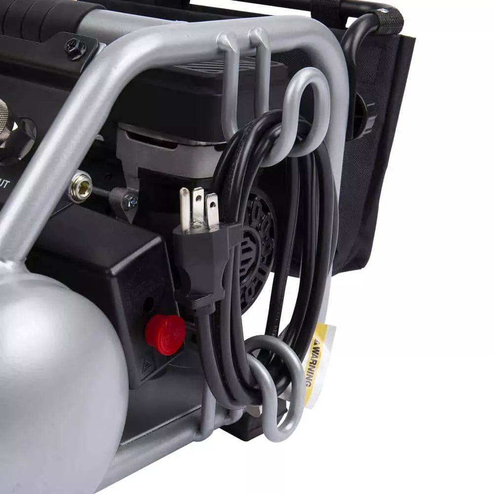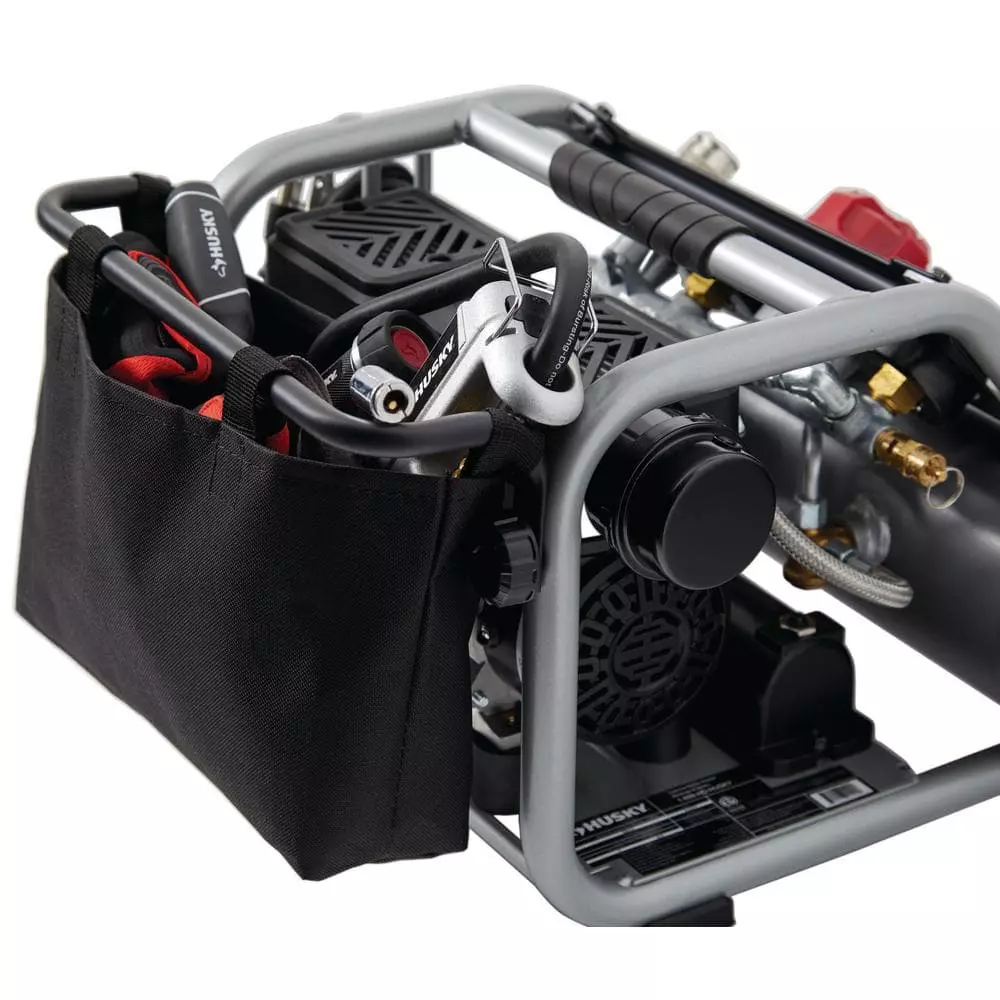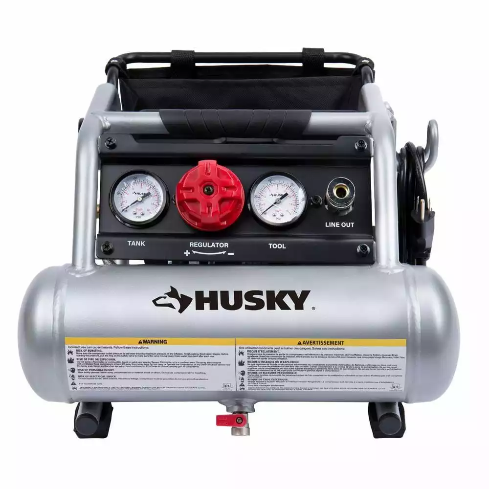 The Husky 1 Gal. Silent Air Compressor is the ideal tool to power home improvement and DIY projects. Its lightweight design (only 30 lbs.) and powerful 1/2 HP motor delivers 0.8 SCFM @ 90 psi with a noise level of only 60 dB. The integrated metal control panel comes with a large regulator knob, 2 metal case gauges and a quick coupler to make connections a snap. The reinforced frame protects the motor from damage and includes convenient cord storage. This compact compressor also features a rubber reinforced handle for easy portability and a built in storage bag to hold tools and accessories. You will find this sturdy compressor is perfect for jobs like inflation, cleaning and operating a stapler or a finishing nailer with ease.