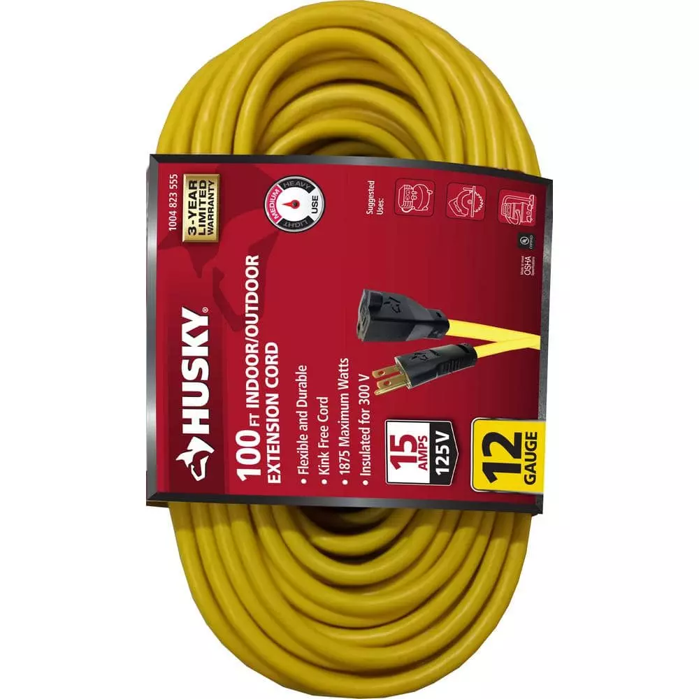 The Husky 100 ft. 12/3 Extension Cord is kink-free and can support up to 125-Volt. This cord is heavy-duty for most job-site and household demands. This extension Cord is great for outdoor usage. It has a capacity of 1,875-Watt with a 3-year limited warranty.