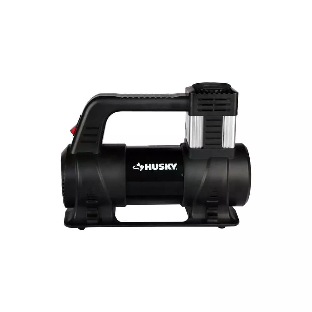 The Husky 120-Volt Inflator inflates vehicle tires, bicycle tires, air mattresses and sports equipment, its direct-drive motor is powerful, quiet and fast, the inflator features an analog pressure gauge with backlight for easy viewing with a maximum pressure detection of 120 PSI, it plugs into a standard household electrical outlet and is equipped with a large power button for no-fuss operation.