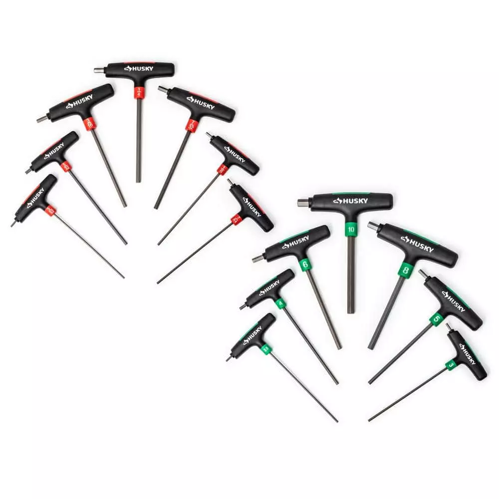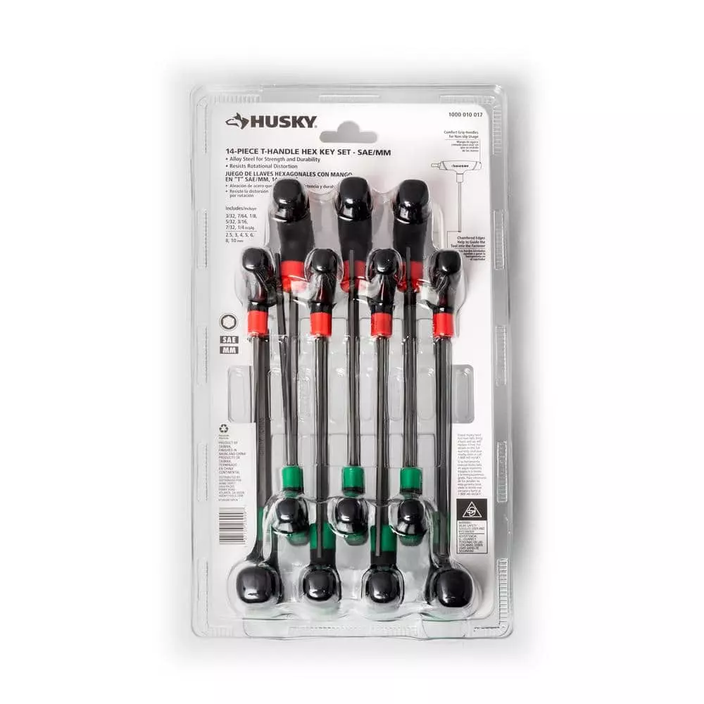 The Husky 14-Piece SAE and MM T-through Handle Hex Key Set is manufactured from allow steel for strength and durability. The comfortable ergonomic grip covers an L-shaped key giving you extra leverage on stubborn fasteners. The keys are designed to resist rotational distortion for years of service.