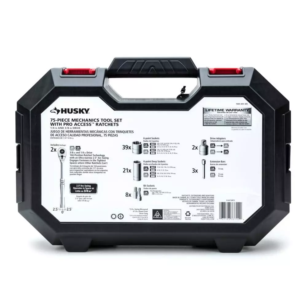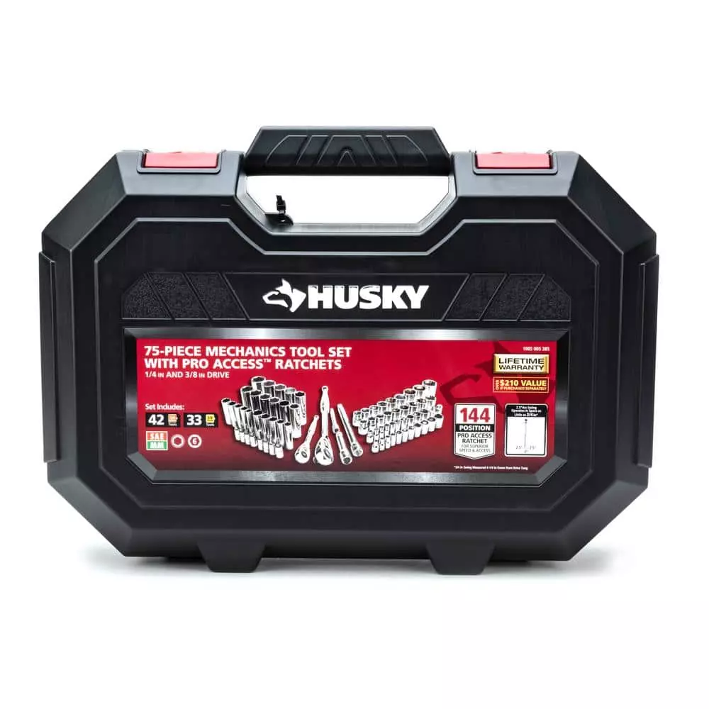 The Dual-pawl technology of the 144-Position ratchet in this Husky 75-piece mechanics tool set provide industry leading access to bolts and fasteners where other ratchets simply can’t. The 68 standard and deep 6-point sockets work to get the job done. The Husky 75-piece 144-position mechanics tools set is perfect for professional mechanics or the DIYer working around the house or in the garage needing access to hard to reach fasteners.
