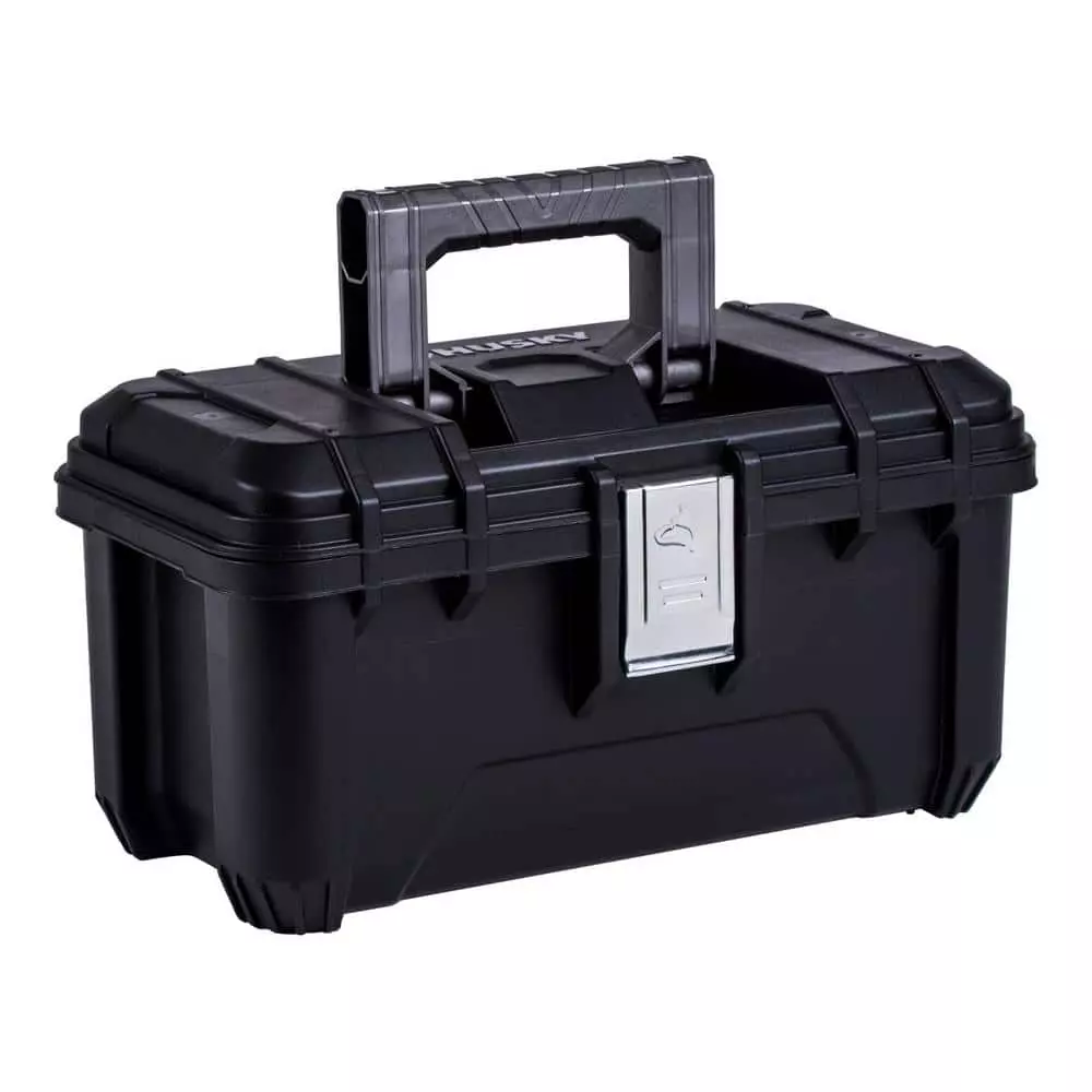 Husky Plastic Tool Box with large Metal Latch features a removable tool tray and durable heavy construction. At 16 in. it allows for ample tool storage with a comfortable carry handle. This tool box is stackable which helps with taking up space.