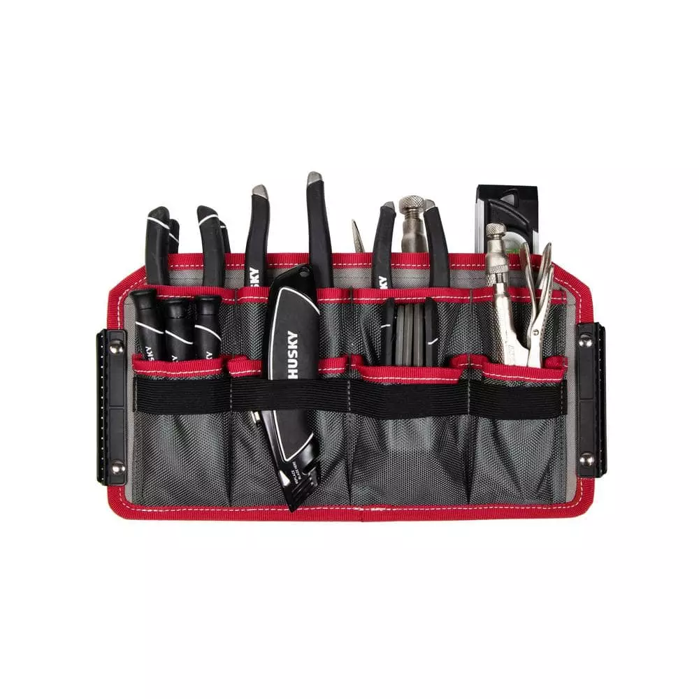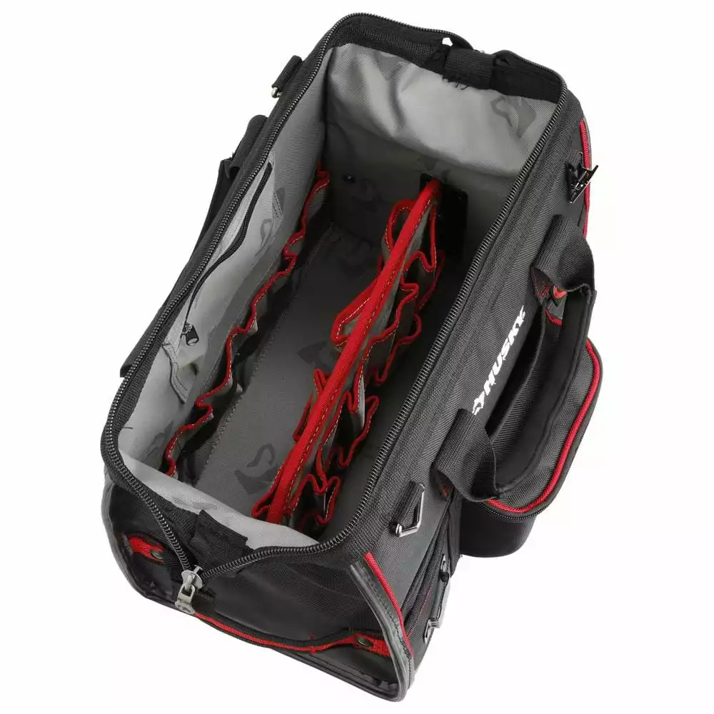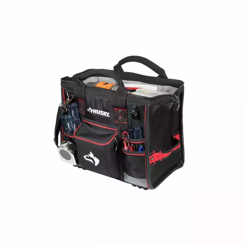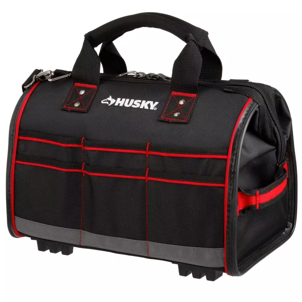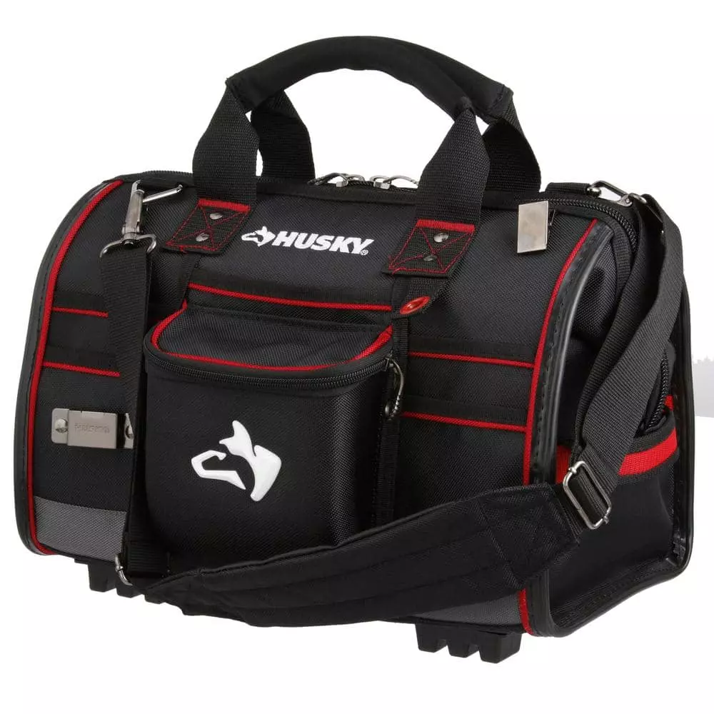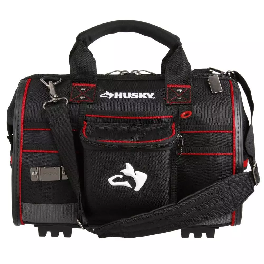 Keep your tools organized and handy with this Husky 16 in. Large Mouth Bag. It features a main compartment with dual lockable security zippers and a hard-sided pocket on the exterior. It also has 11 additional exterior storage pockets, a glove/rag clip for air-dry storage, an easy-access tape clip and a lockable security zipper. This bag will last you over time with a heavy-duty 1680D fabric construction with full reinforced edges. There are five feet on the base and the inside has 25 pockets and elastic straps to hold tools of all sizes.