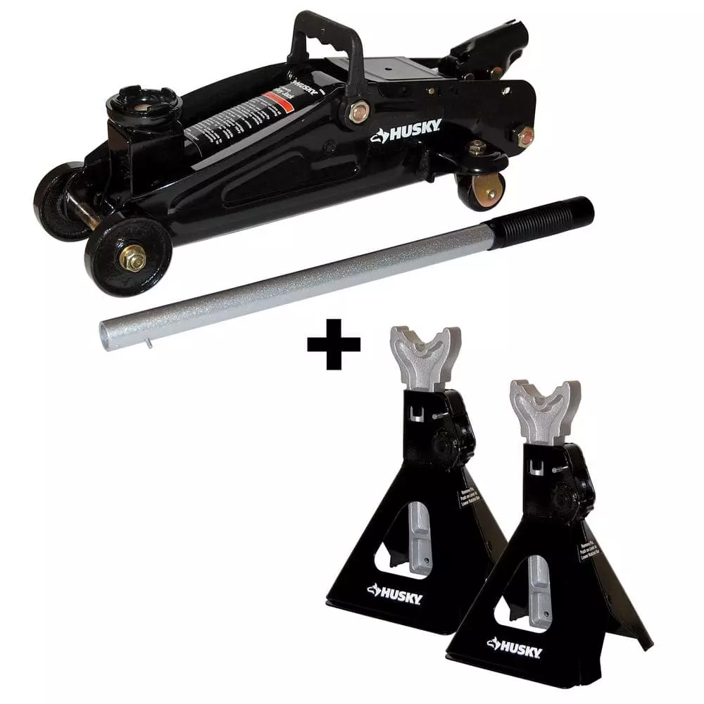 The Husky 2-Ton Hydraulic Trolley Floor Jack is great for use on smaller vehicles. It will lift up to 2-Ton (4,000 lbs.) with minimum lifting height of 5 in. to a maximum lifting height of 13 in. The removable handle and the carrying handle on the 2-ton hydraulic trolley jack makes it easy for storage. This jack is ideal for quick tire change. This car jack is the perfect car accessory to add to your Husky automotive and tool collection. The Husky 3-Ton Jack Stand pair is designed to lift up to 6,000 lbs. (3-tons) with a heavy-duty steel base with anti-sink feet for added durability and safety. This pair of jack stands have an extension range from 12 in. up to 17.5 in. and are equipped with a locking pin for added safety. This jack stand car accessory can be used with an SUV, light truck and standard automobiles. The Husky 3-Ton Jack Stand pair works with any Husky automotive floor jack, found at the Home Depot.