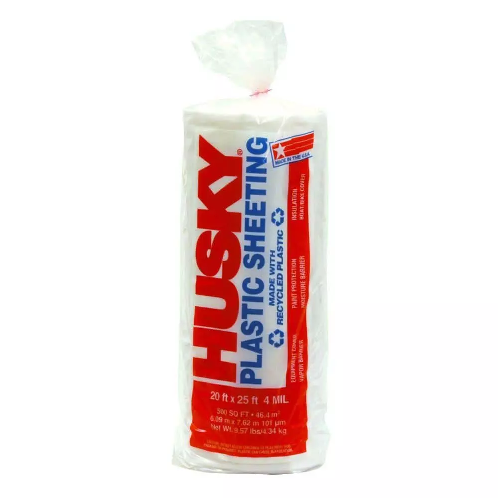 HUSKY 20 ft. x 25 ft. plastic sheeting is a general-purpose plastic film for use in a variety of construction and DIY applications. This sheeting can be used as a vapor barrier in between drywall and insulation. Also commonly used as a drop cloth or a temporary cover for equipment and supplies.