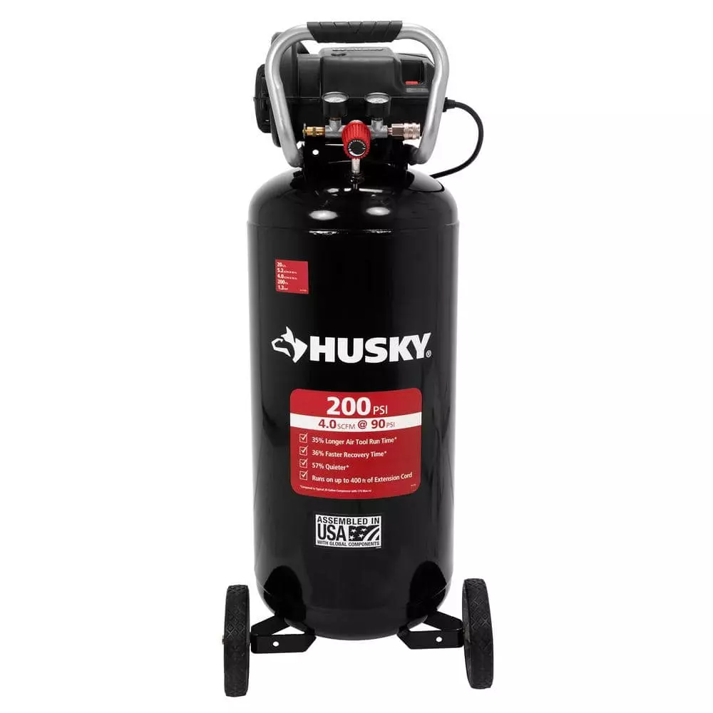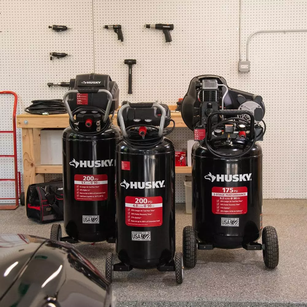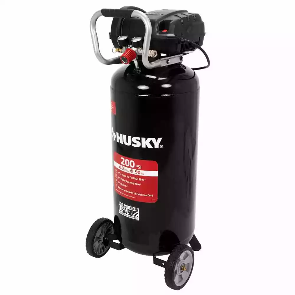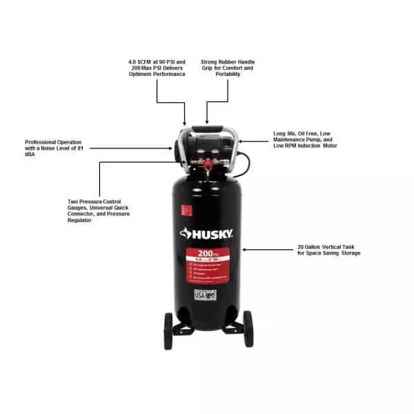 The Husky 20 Gal. oil free air compressor is industry leading with high performance technology. This Husky 20 Gal. portable vertical air compressor with 200 maximum psi provides 35% longer air tool run time compared to typical 20 Gal. compressors with 175 maximum psi . At 81 dBA, the oil free pump brings less noise to your work environment and has a 57% sound improvement versus typical 20 Gal. compressors with 175 maximum psi. The high efficiency motor allows for easier cold weather start as low as -20° F (-29° C) and extension cord application up to 400 ft. of extension cord. The Husky 20 Gal. 200 PSI air compressor is perfect for light automotive tasks, agricultural equipment repairs and intermittent use for metal working applications.