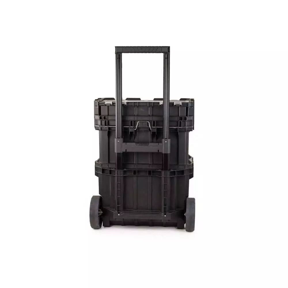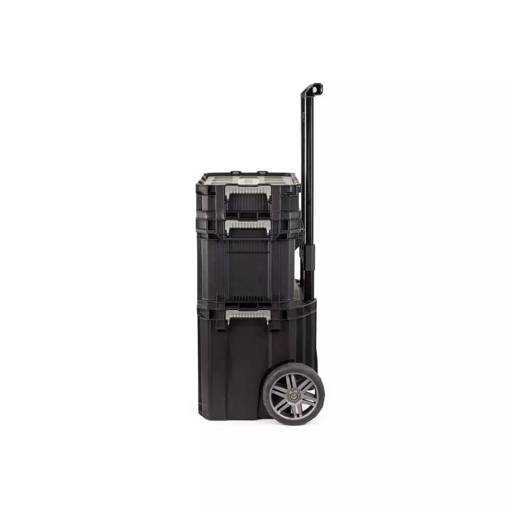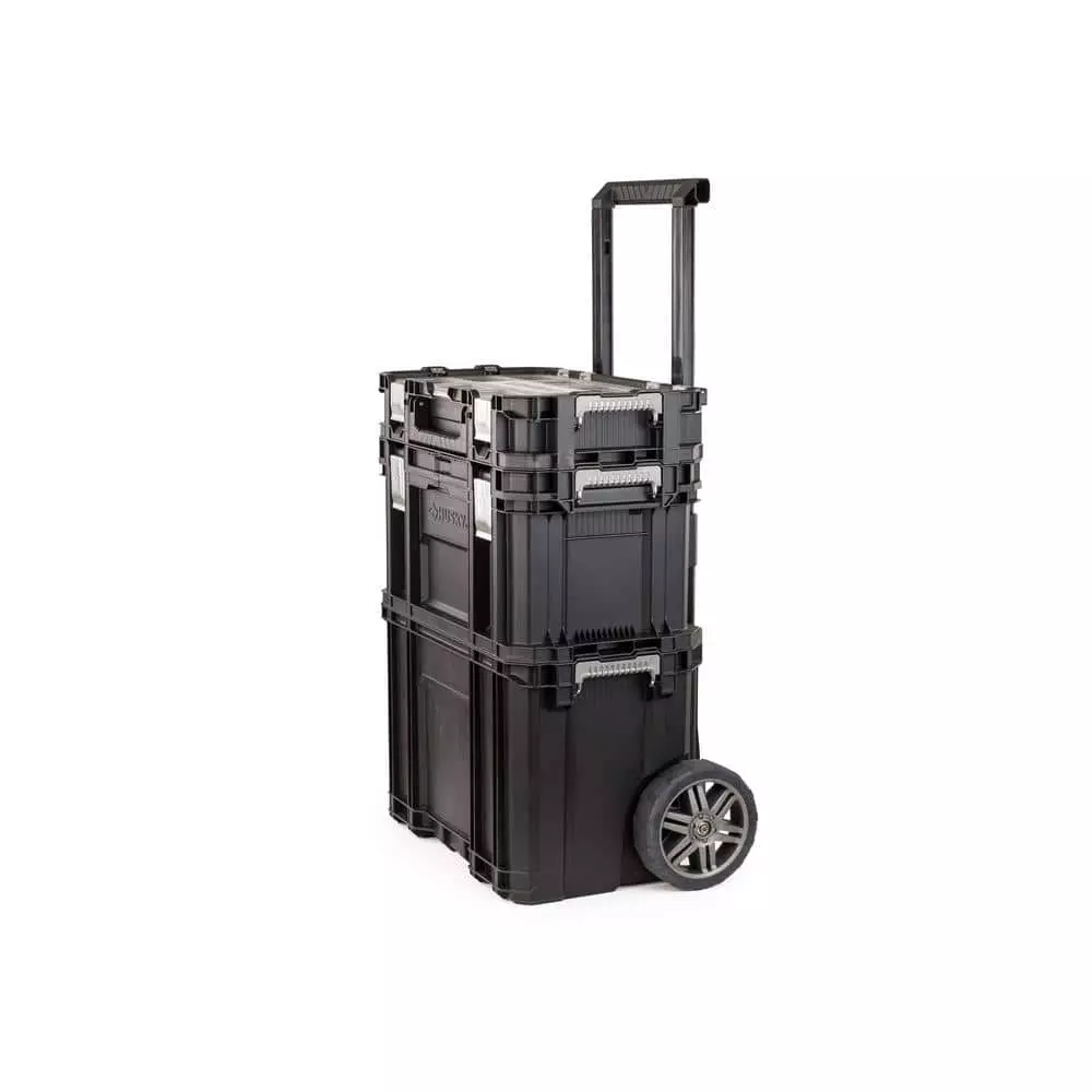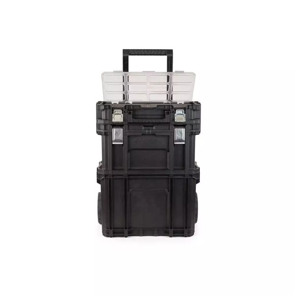 This 22 in. Connect System Rolling Cart features an interconnecting system allowing you to customize the way you transport your tools and accessories. The system features 3-Piece. A rolling cart, toolbox and small parts organizer. The rolling cart base is large for hauling power tools. The rolling cart features 7 in. rolling wheels and strong telescoping handle. The mid tool box is 22 in. W and features a flat lid surface to double as a work surface. The deep pro organizer features 12 removable bins.