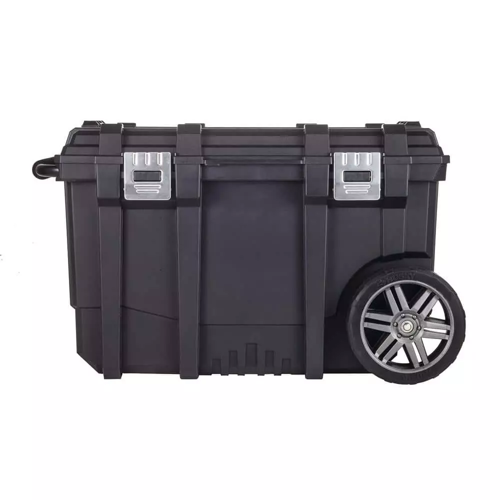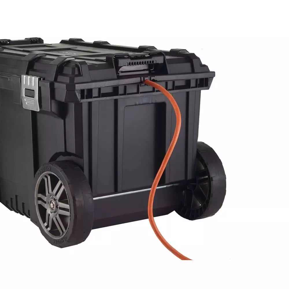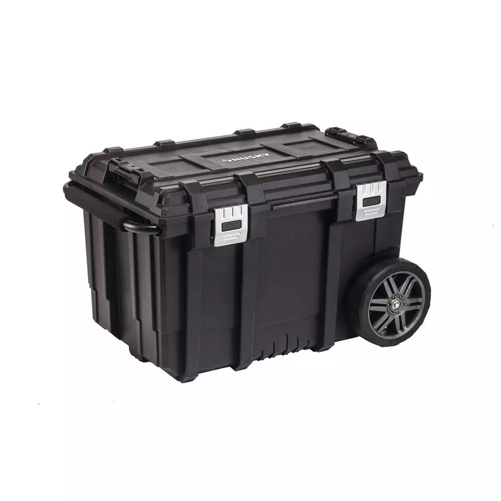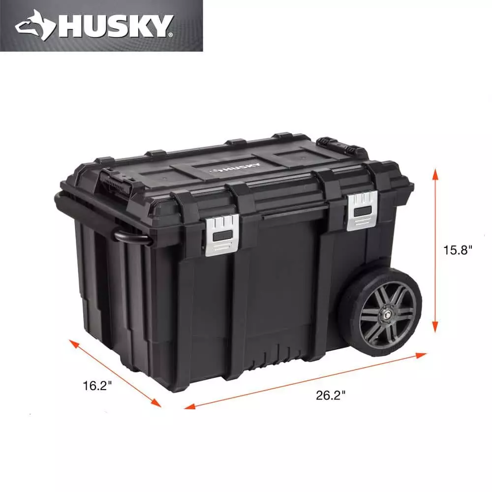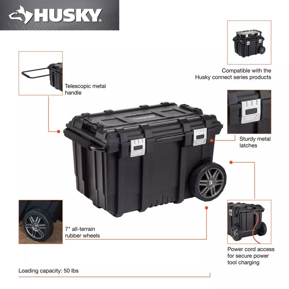 Introducing the new husky 15 Gal. Connect job box. This heavy-duty mobile job box provides a unique way of organizing your tools and parts. The top lid area boasts an innovative connection latches, compatible with other husky connect system product. The base unit has the capacity to accommodate your power tools. This well-designed tool box has 5250 cu. In. Of total storage capacity for organizing and storing your tools and accessories. Large 8 in. All terrain wheels and extendable metal tubular handle makes this cart very mobile on any surface. The job box is also pad lockable.