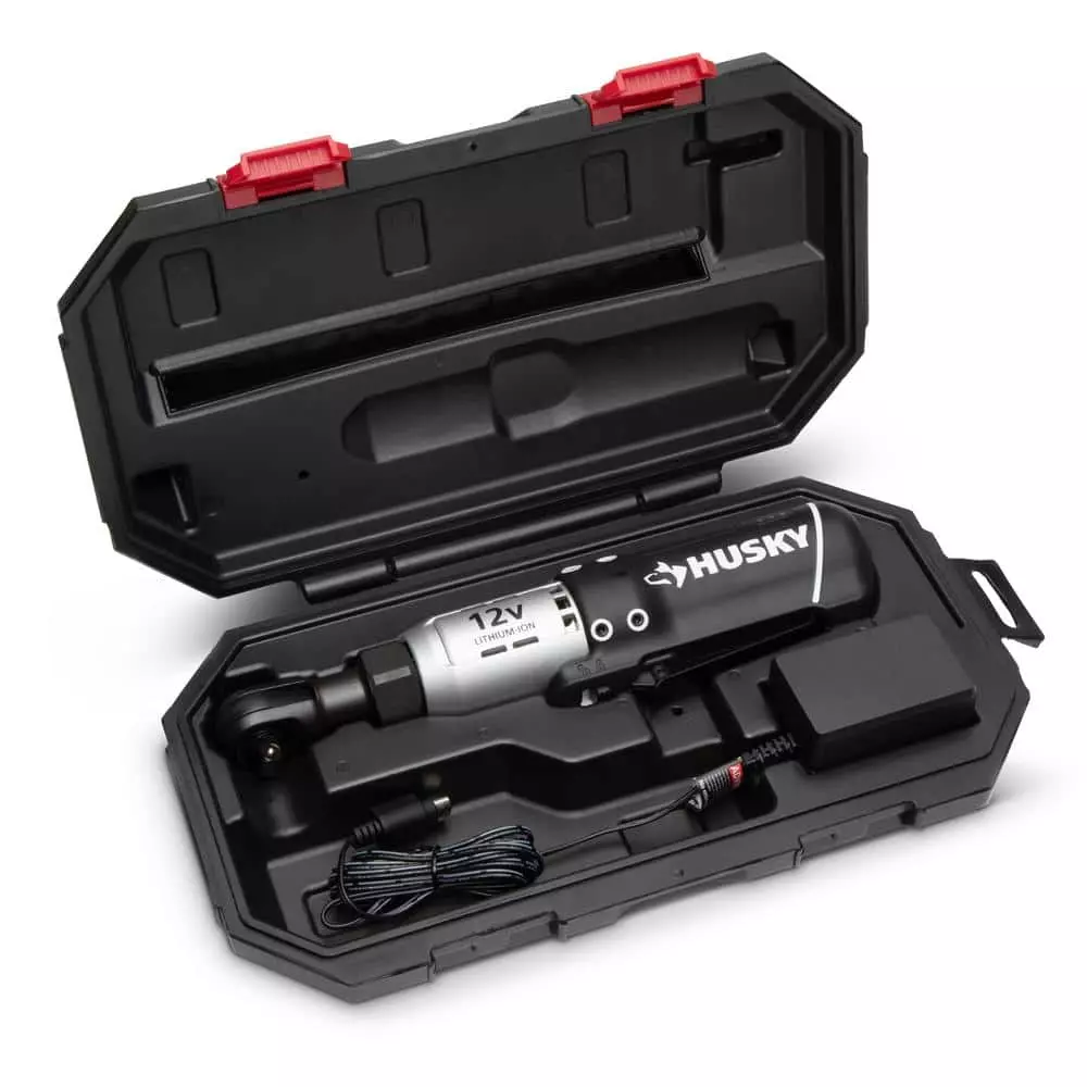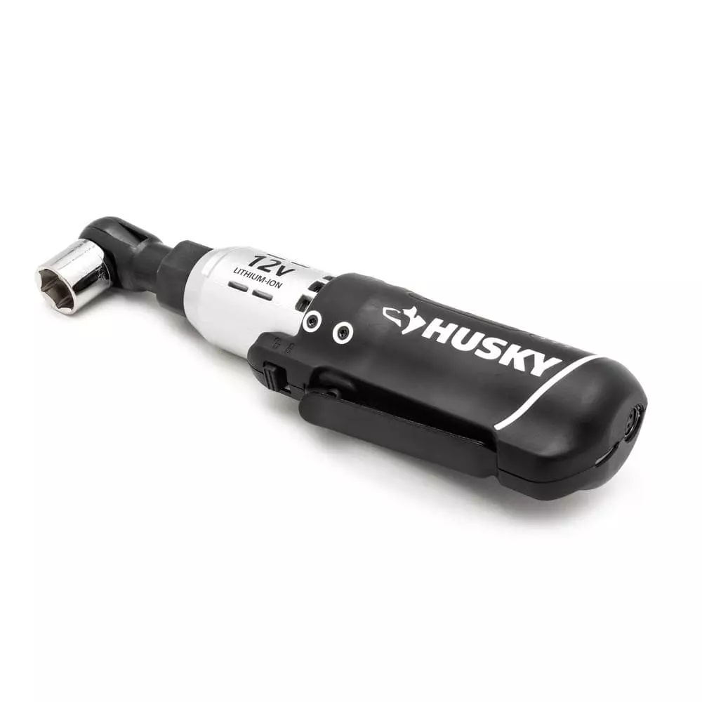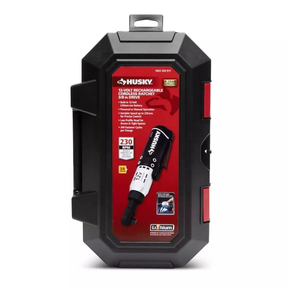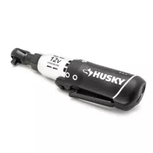 The Husky 3/8 in. drive cordless ratchet features a 12-Volt Lithium-Ion battery that produces 230 RPM. The low profile head and built-in LED lights provide users with the means to see and access tight working areas. Higher visibility and accessibility will make any job easier. The Ratchet can produce up to 30 ft./lbs. of powered torque, with variable speeds for precise control.
