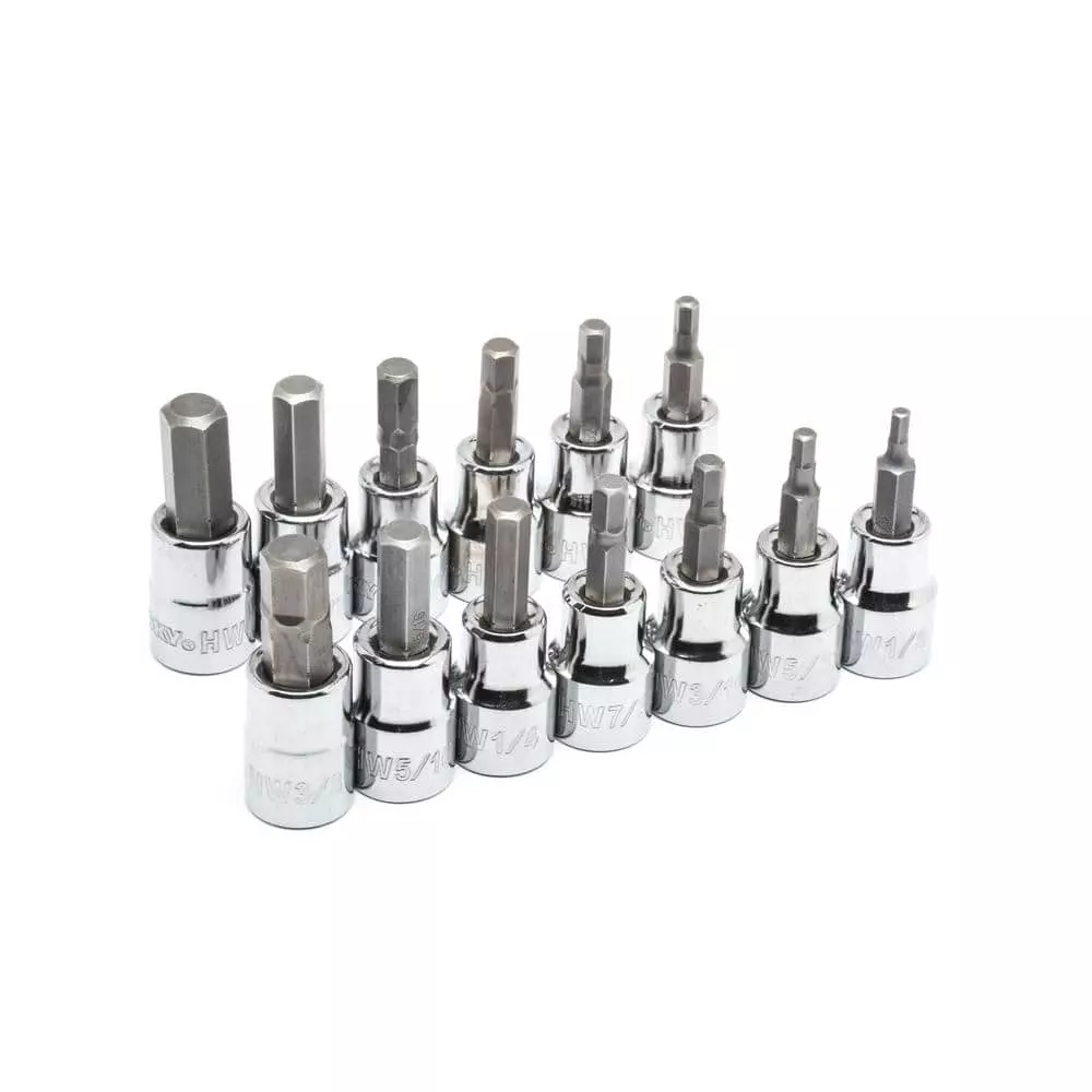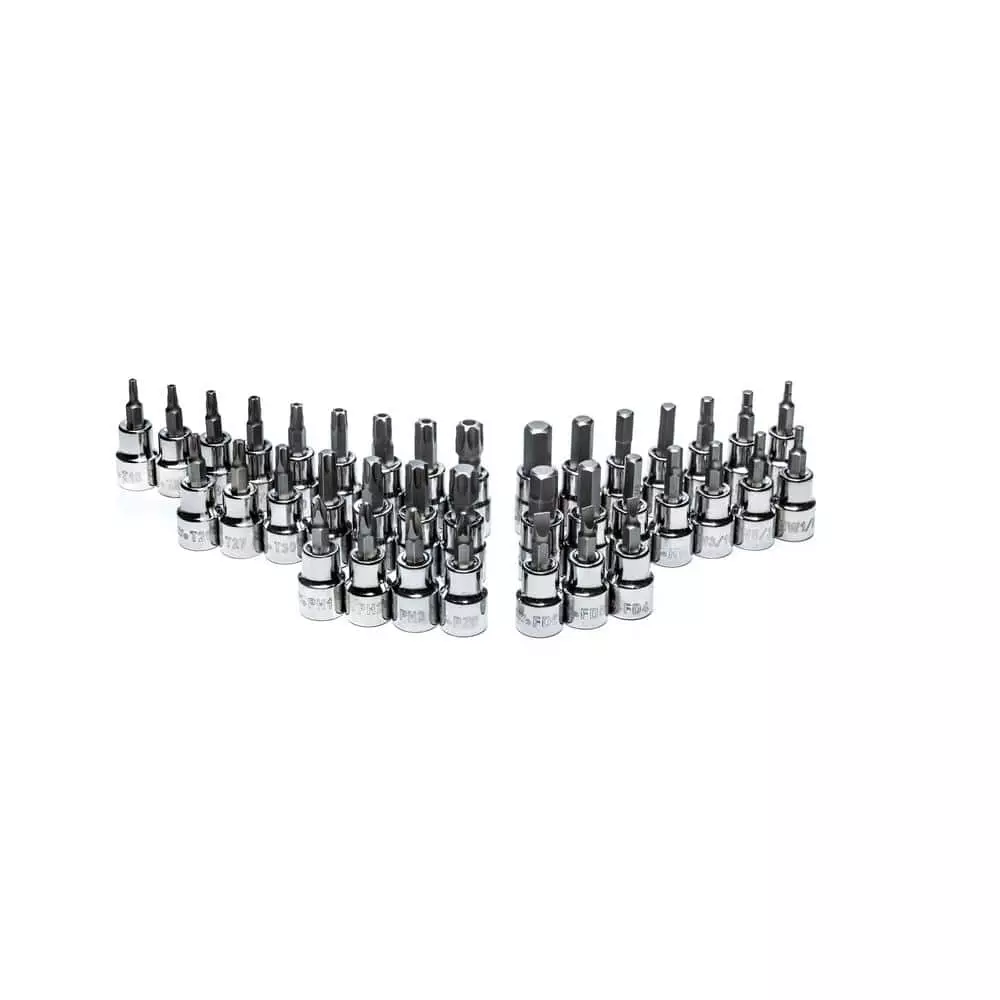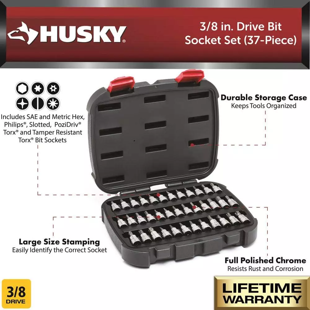 Husky 37-Piece 3/8 in. drive all-in-one bit socket set features 6 different styles of bit heads and is perfect to complete your socket collection. Alloy steel construction of both the socket and the bit provides durability and long lasting performance. All 37 bit sockets come in a durable plastic case for easy organization and storage.