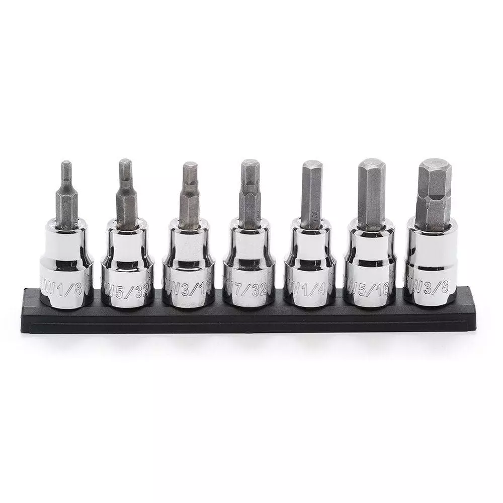 - Set includes seven 3/8 in. drive hex bit sockets: SAE – 1/8 in. x 5/32 in. x 3/16 in. x 7/32 in. x 1/4 in. x 5/16 in. x 3/8 in.