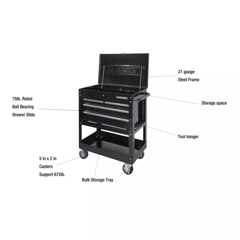 The Husky 33 in. 4-Drawer Mechanics Tool Cart is a heavy-duty utility cart that is essential in the shop, garage or even the office. The multi-sized drawers are equipped with 75 lbs. rated ball bearing slides to hold a variety of tools. The bottom storage tray is reinforced steel for your larger, heavier items and has approximately 14.5 in. of storage space height. The top storage area is a perfect place to keep your commonly used items easily within reach. In addition, the top storage area of the tool cart includes a locking lever to secure the 4-drawers and a keyed lock to secure the lid. The larger, push-bar handle and heavy-duty, 5 in. x 2 in. casters allow this cart to be easily moved around your work area. With no clumsy washers and nuts to deal with, this tool cart can be assembled in minutes with the included bolts and pre-mounted threads.