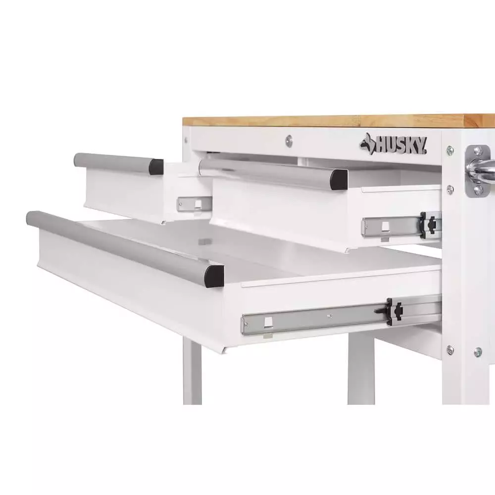 The Husky 36 in. 3-Drawer Tool Cart is the perfect combination of a mobile work center and a mechanic’s tool cart. The fixed wood top is made of solid para-wood, which provides a durable work surface that is both stylish and practical. The 3-drawers have 50 lbs. rated ball bearing slides to hold a variety of tools. The bottom storage tray is reinforced steel for your larger, heavier items. The large, push bar handle and heavy-duty, 5 in. x 2 in. casters allow this cart to be easily moved around your garage, shop, hobby room or office. With no clumsy washers and nuts to deal with, this tool cart can be assembled in-minutes with the included bolts and pre-installed speed nuts.