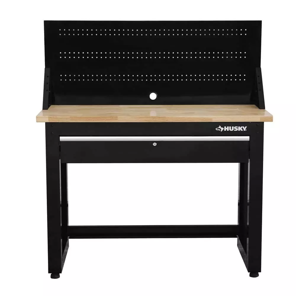 Extend your workspace with this Husky 4-ft. workbench. The solid wood top holds up to 1,500 lbs., and the heavy-duty steel legs provide stability. For versatility, it comes with a drawer, pegboard and holders. Included tools enable easy assembly. Perfect for garages, basements and workshops, it’s made to resist extreme temperatures and high humidity.