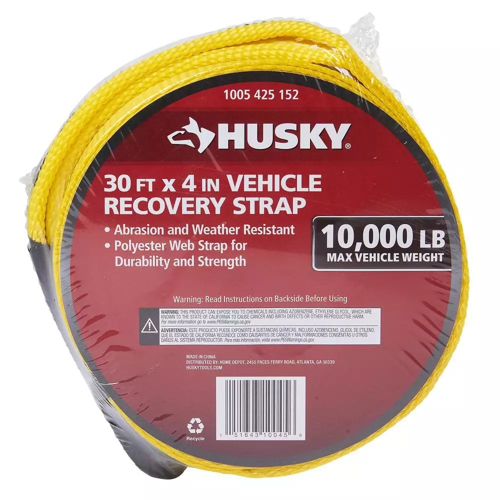 The 30 ft. Vehicle Recovery Strap is constructed with quality material for long-lasting versatility and dependability. It features a durable 4 in. Hi-Test webbing and reinforced black wear guard fabric looped ends. The recovery strap is ideal for emergency towing of stuck or disabled vehicle and is a great alternative for chains. The strap won’t rust, rot or mildew and can endure the elements and repeated use. The Vehicle Recovery Strap is lightweight, compact making it portable and easy to store.