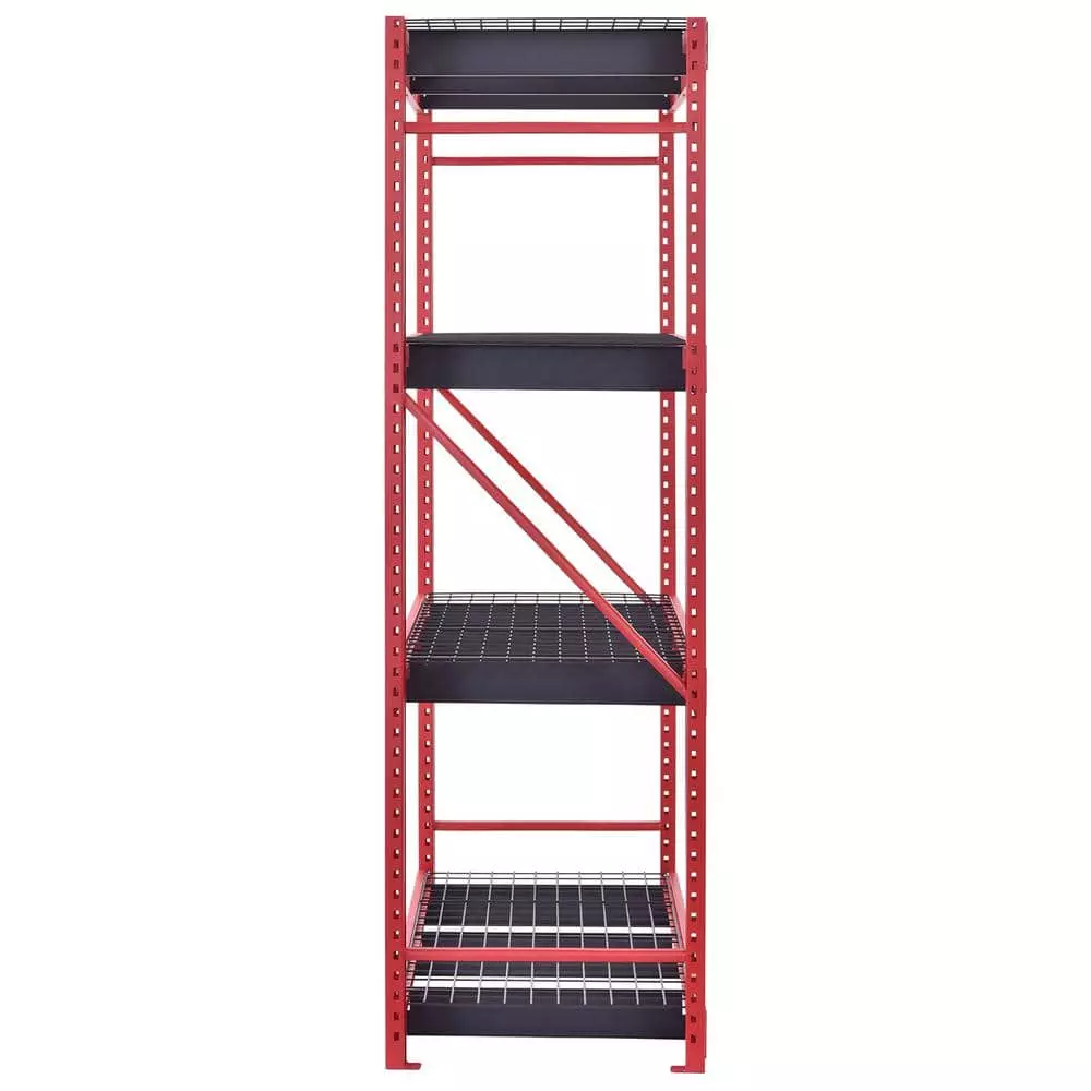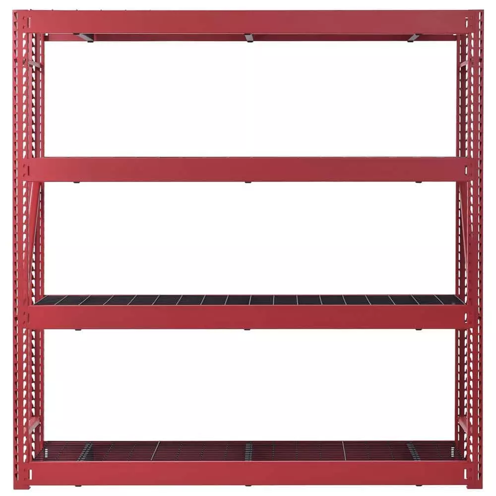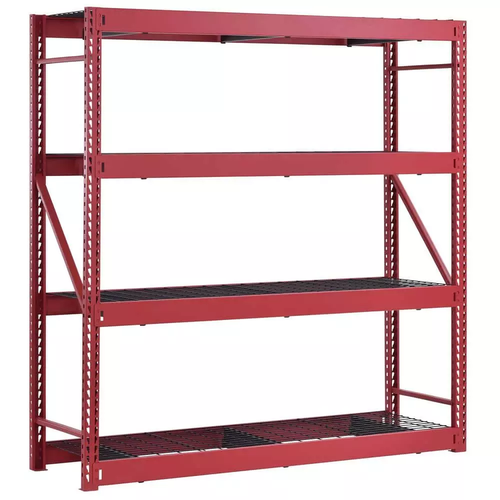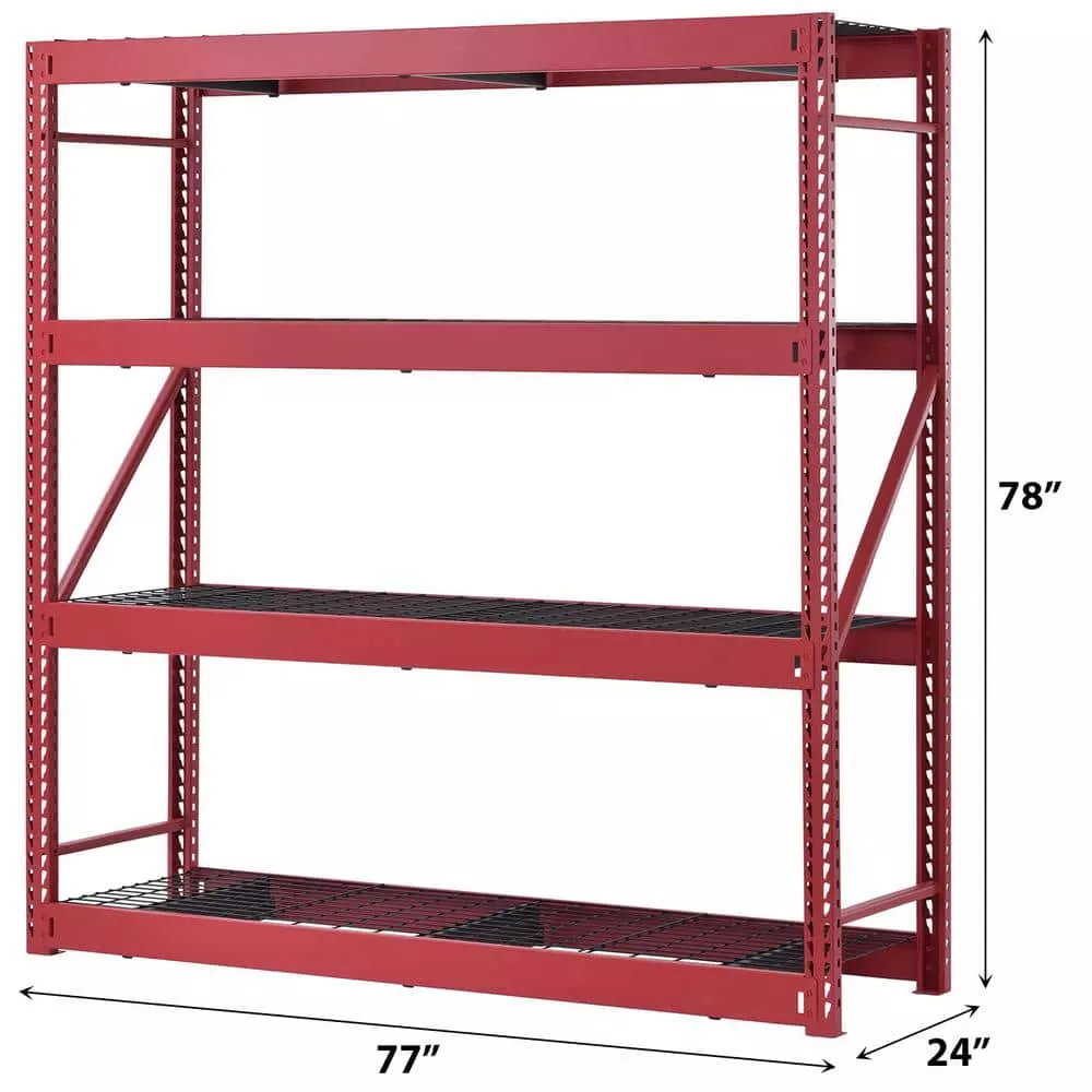 Perfect for organizing your garage or workshop, Husky’s Welded Frame Shelving Unit measures 78 in. H x 77 in. W x 24 in. D. The 4-adjustable black wire shelves provide ample storage space to accommodate a variety of heavy items, each shelf supporting up to 2500 lbs. This unit is constructed with steel in a textured finish for durability and strength. Bolt-free and easy to assemble.