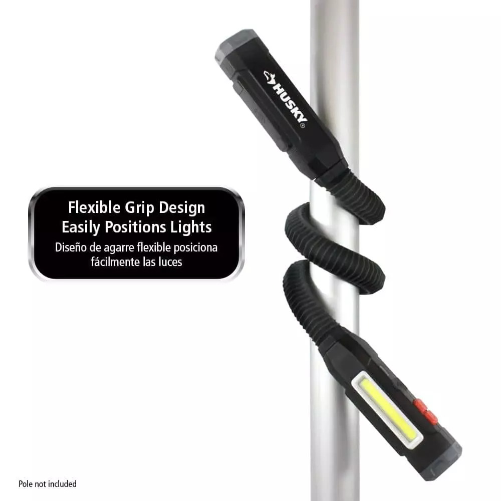 The Husky Flexible Work Light is a soft grip gill technology that allows you to wrap light tightly around objects leaving your hands free to work. Prop, coil and morph the light into any shape giving you the freedom to aim light in infinite directions. The Husky light has 3 modes for infinite uses. For 2 incredibly bright direct beams, articulate the front of the lights in any direction. For a dispersed flood light use the COB flood light. For extended battery life, dim the light to your desired setting. Simply press and hold the power switch to dim. With it’s soft and flexible design, this innovative light is comfortable enough to be worn around the body. Wrap it around your wrist or rest it on your neck for hands-free use. Included in the design is a heavy-duty magnet, giving you the versatility to magnetize it to any ferrous metal objects, including cars, the work ship, a toolbox or even the fridge. The Husky light is designed to operate in wet conditions, with an IPX4 water resistance rating. Made of high tensile silicone material, this light will hold up to the harshest conditions and is impervious to most automotive fluids.