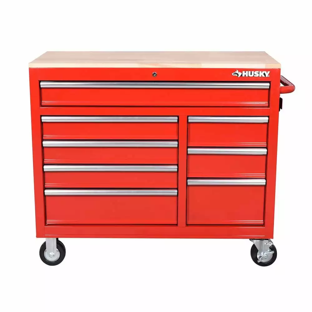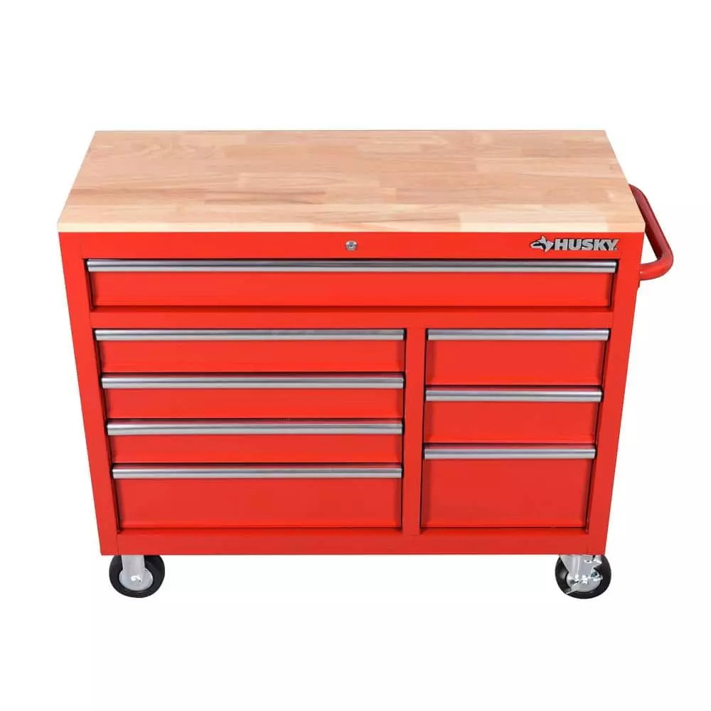 Husky 42 in. W x 18.1 in. D 8-Drawer Red Mobile Workbench Cabinet with Solid Wood Top