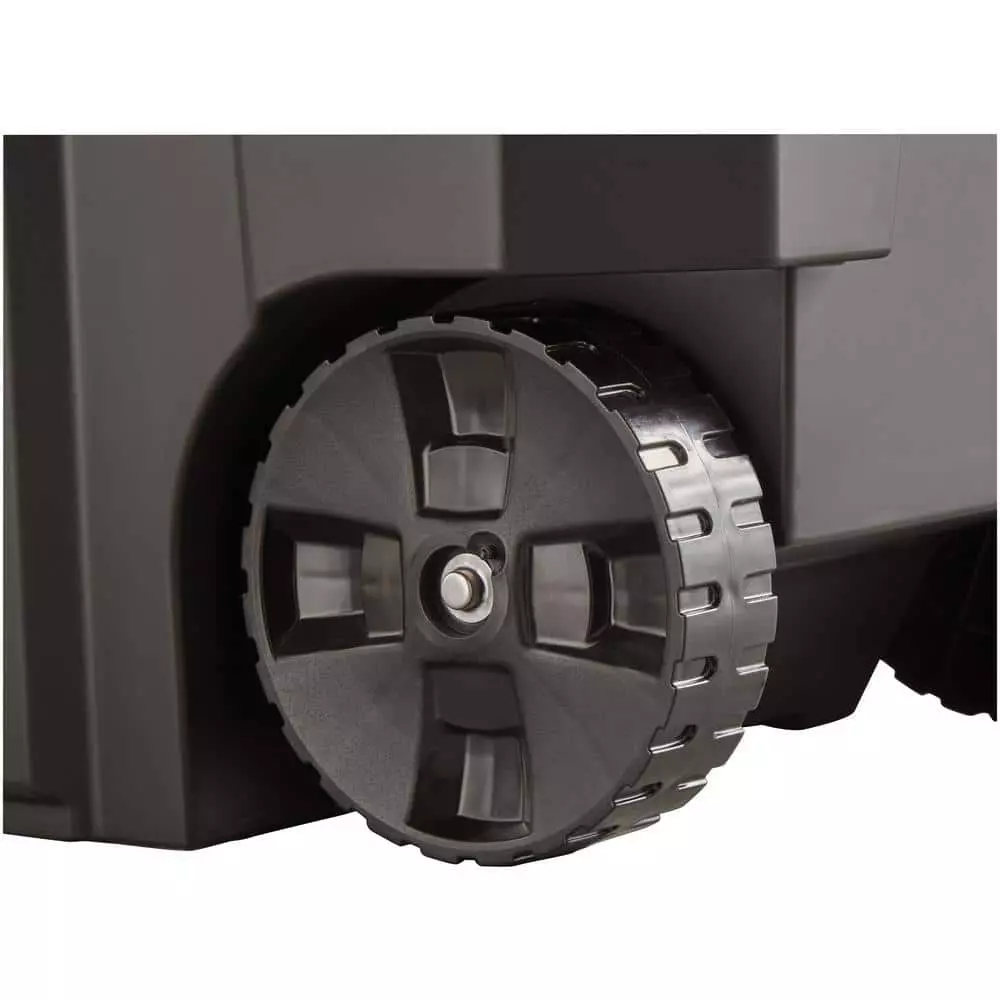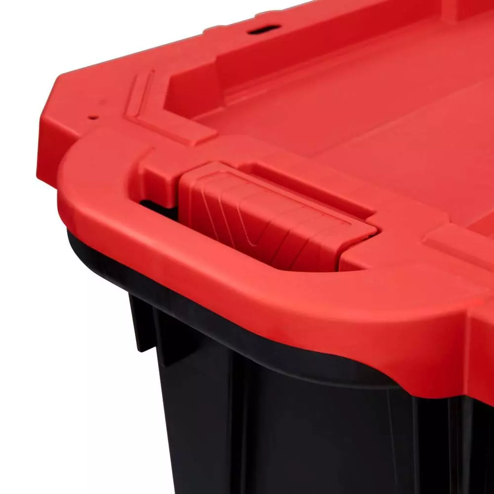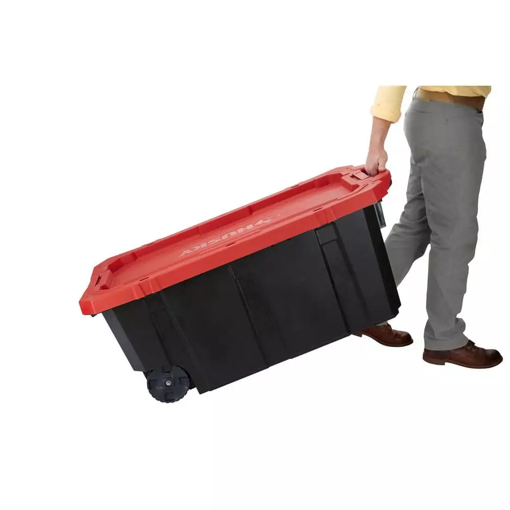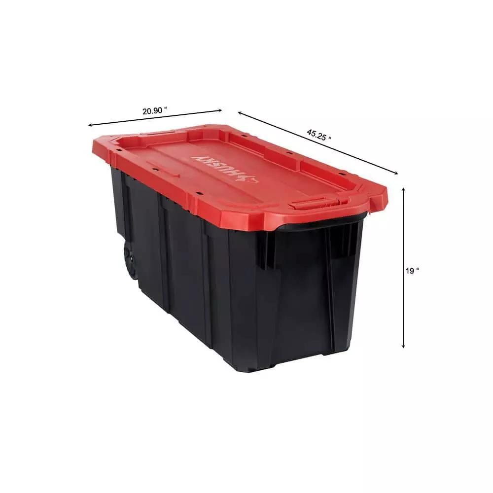 This Husky 45 Gal. heavy duty stackable storage tote is designed to handle all your storage needs whether it’s on the jobsite or around the house. The tote includes a black base made from durable recycled polypropylene and a red reinforced lid with red latches to secure and protect your valuables. This tote is a perfect option for the meticulous organizer who demands the very best in heavy-duty storage and protection. Integrated slots make the tote lockable to keep away unwanted intruders. This tote features innovative tie-down channels that allow it to be easily strapped down for simple transportation and fits most Hitch Mounted Cargo Carriers. Wheels added to make this the ultimate workers totes for easy transport.