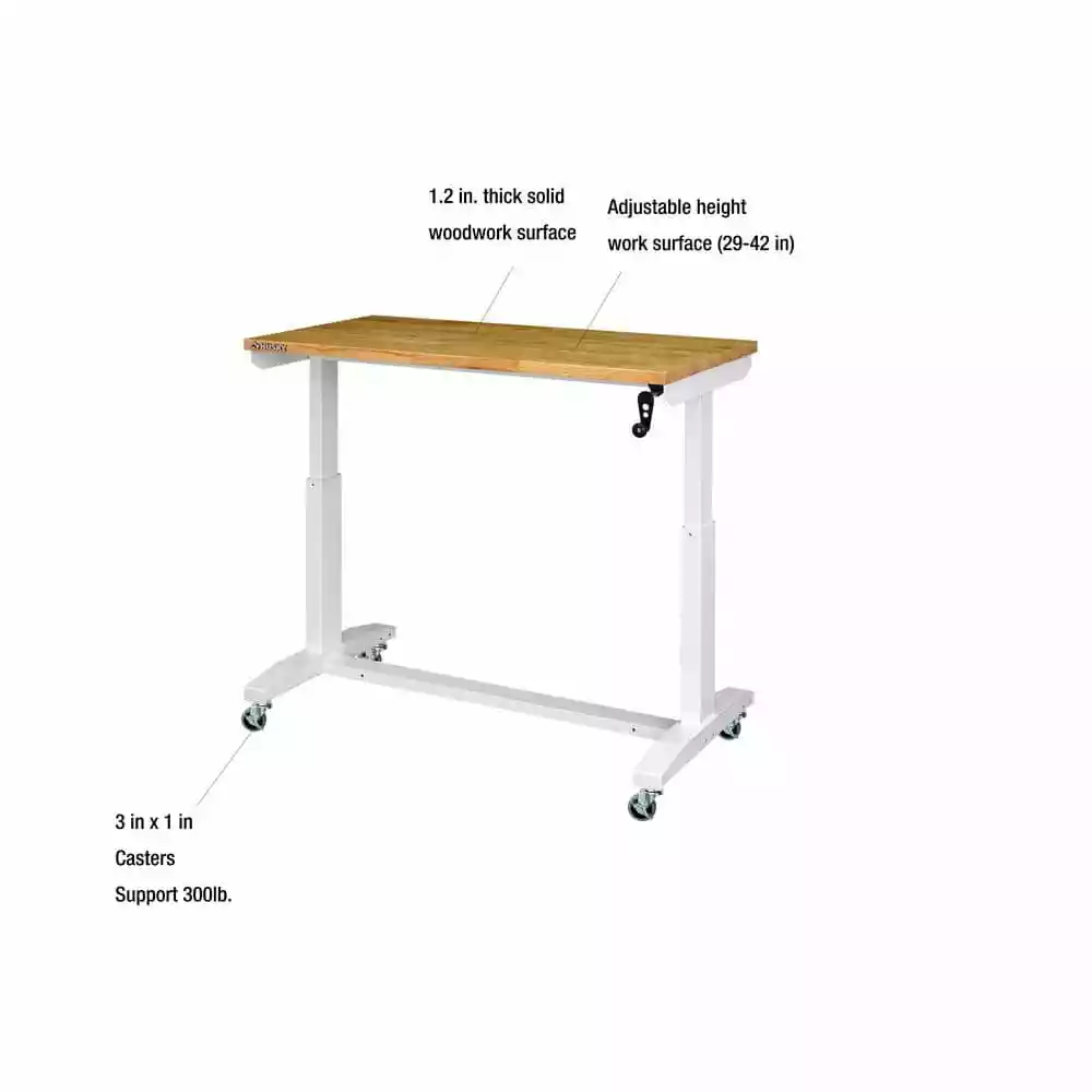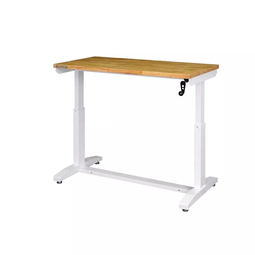 Elevate your work experience with the Husky 46 in. Adjustable-Height Work Table. This multi-functional work station features a manual crank that can raise and lower the work surface height. The 1.2 in. thick, solid wood top is rugged and beautiful and there is plenty of space on the 46 in. W x 24 in. D work surface. The workbench can be assembled with either the four, 3 in. x 2 in. polypropylene casters for mobility or attach the 4 leveling feet for use as a stationary table or desk. This work table has plenty of uses around the home, office, hobby room or garage. It is designed with a 300 lbs. load capacity and an overhang so that you can easily attach your vise grips or cl-Amps while working on a project. This 46 in. Husky Work Table’s contemporary, adjustable-height feature allows you to have the flexibility to sit or stand while working. Research suggests that there are health benefits to alternating between standing and sitting throughout the day because it both decreases body discomfort and increases blood flow. The ergonomic design could also reduce eye and back strain and boost your productivity. The crossbar support can be installed in 2 different locations, depending on your preference. Install the support at the center of the table for an open, 2-sided work area. Or install it along the back of the legs to allow you the versatility of stowing your tool storage and rolling cabinets underneath to further organize your work space.