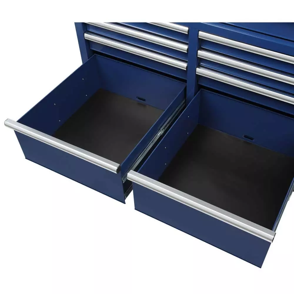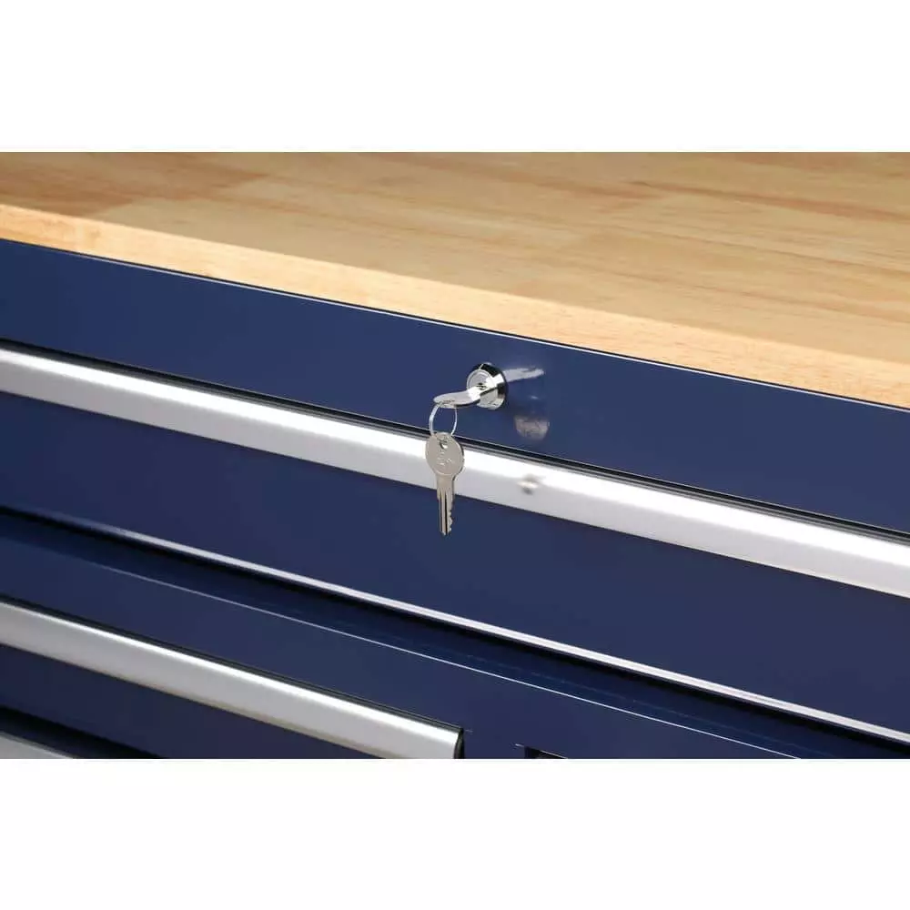 The all new Husky Extra-Deep 46 in. 9-Drawer Mobile Work Bench has arrived. This work bench is 24.5 in. D, which creates 36% more storage capacity than traditional 18 in. D units. The extra-depth also means there is a much larger solid wood top to use as a work surface for all your projects. An integrated power strip on the side of the work bench provides easy access to 6 outlets and 2 USB Ports, so your tools and other electronic devices can always be charged up and ready to go. There is plenty of storage options within the work bench inside the 9 lockable 21.7 in. D drawers. Each drawer glides easily on 100 lbs. rated ball-bearing soft-closing drawer slides and the large bottom drawers have an extra-set of slides to accommodate heavier items up to 200 lbs. Each drawer also has a premium pre-cut drawer liner that will protect both your tools and drawers. Finally, the entire work bench can easily move around your work space with four 5 in. x 2 in. casters and large ergonomic push handle.