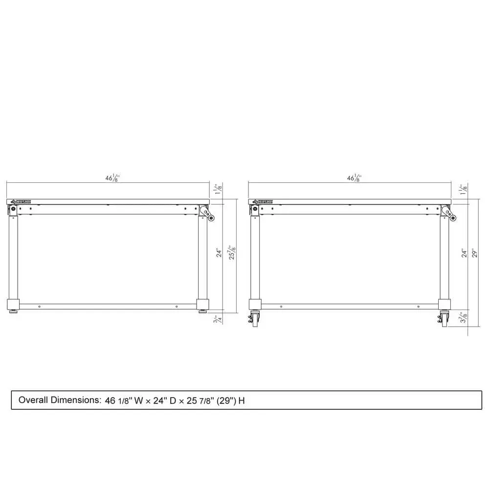 Elevate your work experience with the Husky 46 in. Adjustable-Height Work Table. This multi-functional work station features a manual crank that can raise and lower the work surface height. The 1.2 in. thick, solid wood top is rugged and beautiful and there is plenty of space on the 46 in. W x 24 in. D work surface. The workbench can be assembled with either the four, 3 in. x 2 in. polypropylene casters for mobility or attach the 4 leveling feet for use as a stationary table or desk. This work table has plenty of uses around the home, office, hobby room or garage. It is designed with a 300 lb. load capacity and an overhang so that you can easily attach your vise grips or cl-Amps while working on a project. This 46 in. Husky Work Table’s contemporary, adjustable-height feature allows you to have the flexibility to sit or stand while working. Research suggests that there are health benefits to alternating between standing and sitting throughout the day because it both decreases body discomfort and increases blood flow. The ergonomic design could also reduce eye and back strain and boost your productivity. The crossbar support can be installed in 2 different locations, depending on your preference. Install the support at the center of the table for an open, 2-sided work area. Or install it along the back of the legs to allow you the versatility of stowing your tool storage and rolling cabinets underneath to further organize your work space.