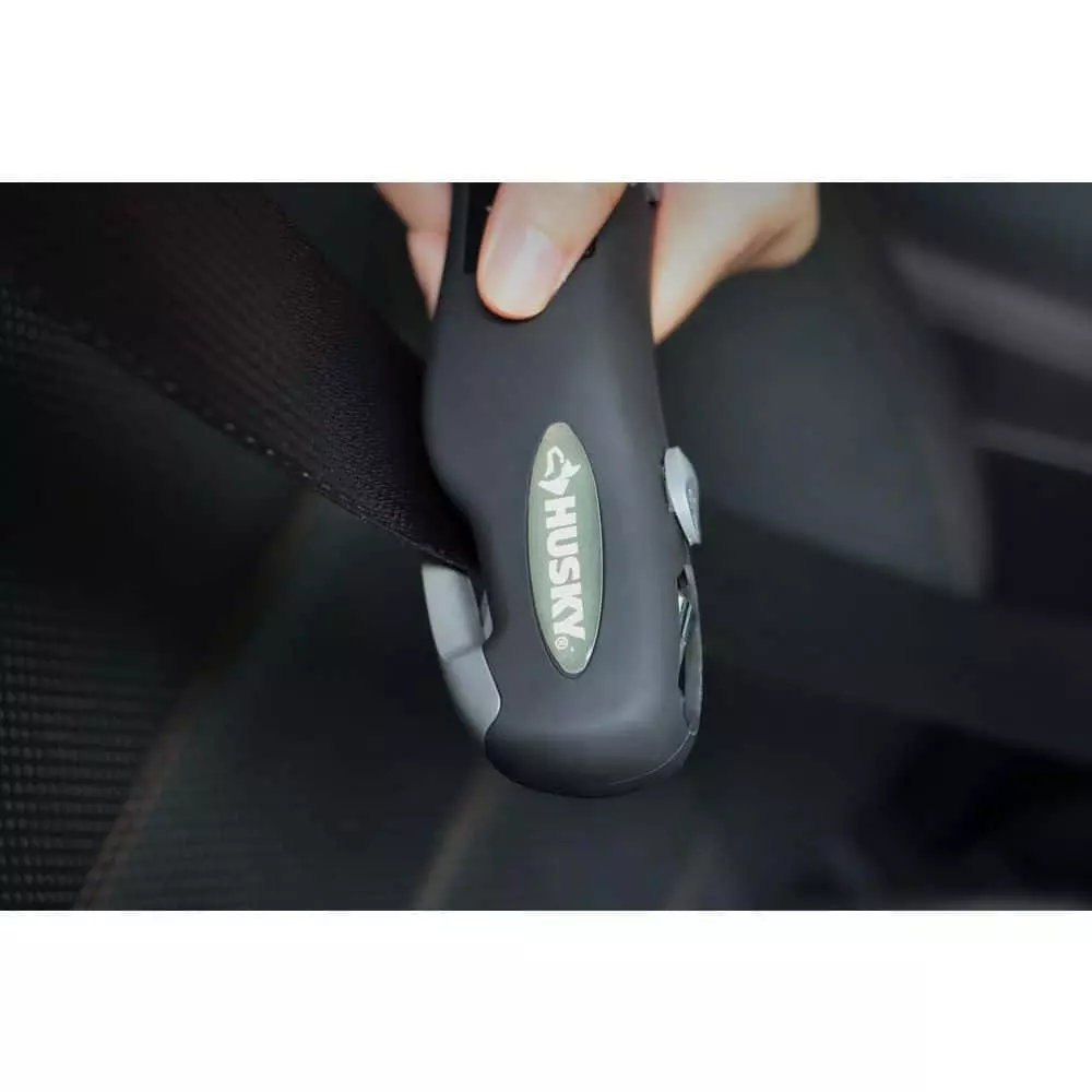 - 5-in-1 design includes a digital tire gauge, a steel safety hammer, a metal seatbelt cutter, a LED torch and a red LED light