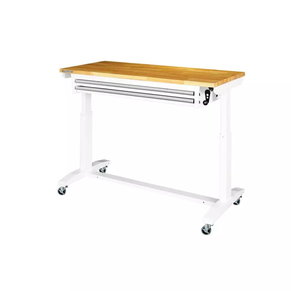 The Husky 52 in. Adjustable-Height Work Table with 2-Drawers is a multi-functional adjustable workbench with drawers work station that features a manual crank that can raise and lower the work surface. The 1.2 in. thick solid wood top offers plenty of space on the 52 in. W x 24 in. D work surface. The adjustable height work table with drawers can be assembled with either the four, 3 in. x 2 in. casters for mobility or attach the 4 leveling feet for use as a stationary table or desk. This Husky adjustable workbench with drawers has plenty of uses around the home, office, hobby room or garage. It is designed with a 300 lbs. weight capacity and an overhang so that you can easily attach your vise grips or clamps while working on a project. This 52 in. Husky adjustable height work table with drawers contemporary, adjustable-height feature allows you to have the flexibility to sit or stand while working. The ergonomic design could also reduce eye and back strain and boost your productivity. The crossbar support can be installed in 2 different locations, depending on your preference. Install the support at the center of the table for an open, 2-sided work area. Or install it along the back of the legs to allow you the versatility of stowing your tool storage and rolling cabinets underneath to further organize your work space.