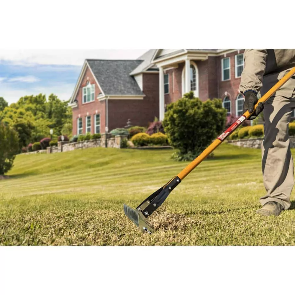 The thatching rake is an all-purpose lawn rake. Its curved tines were designed to clear dead grass clippings from the lawn. This will allow sunshine, air, water and fertilizers in to keep the grass healthy.