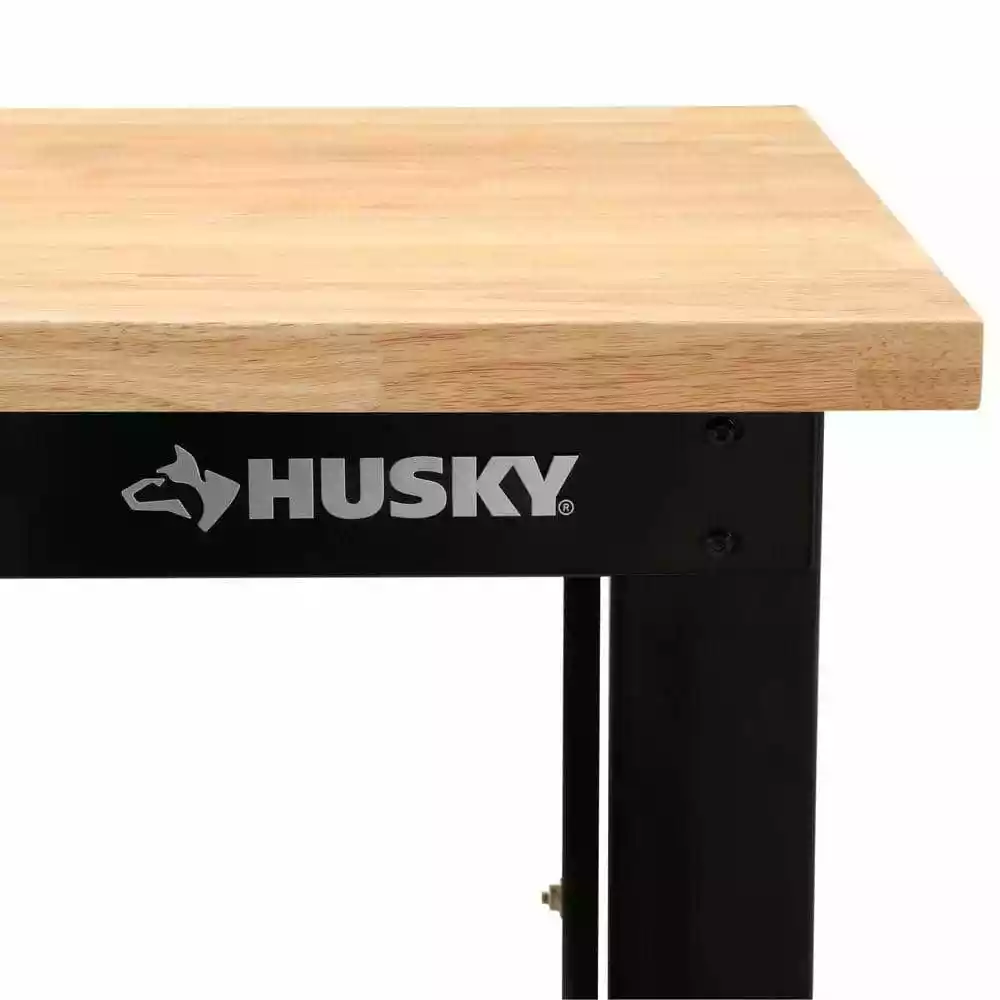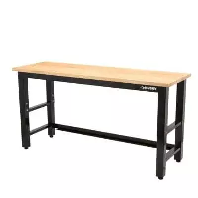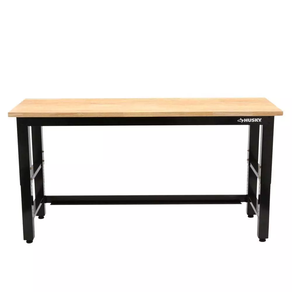 Extend your workspace with this Husky 6-ft. workbench. The 1.25-in. solid wood top holds up to 3,000 lbs. and the height is adjustable from 28 in. to 42.1 in. in 1-in. increments, letting you work from a seated or standing position. For convenience, adjustable legs provide stability on uneven floors. Included hardware enables easy assembly.