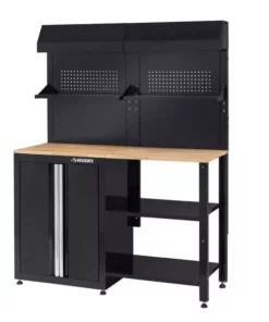 Safely store your important items with this 6-Piece Ready-to-Assemble Steel Garage Workstation in Black (53 in. W x 69.5 in. H x 19.5 in. D). It features two shelves, two trays, two wall cabinets and a welded base cabinet. You can easily assemble this garage workstation. The strong, powder-coated steel material makes this a durable option for your home.