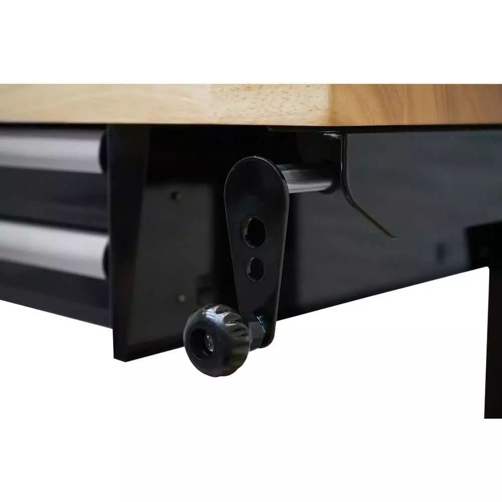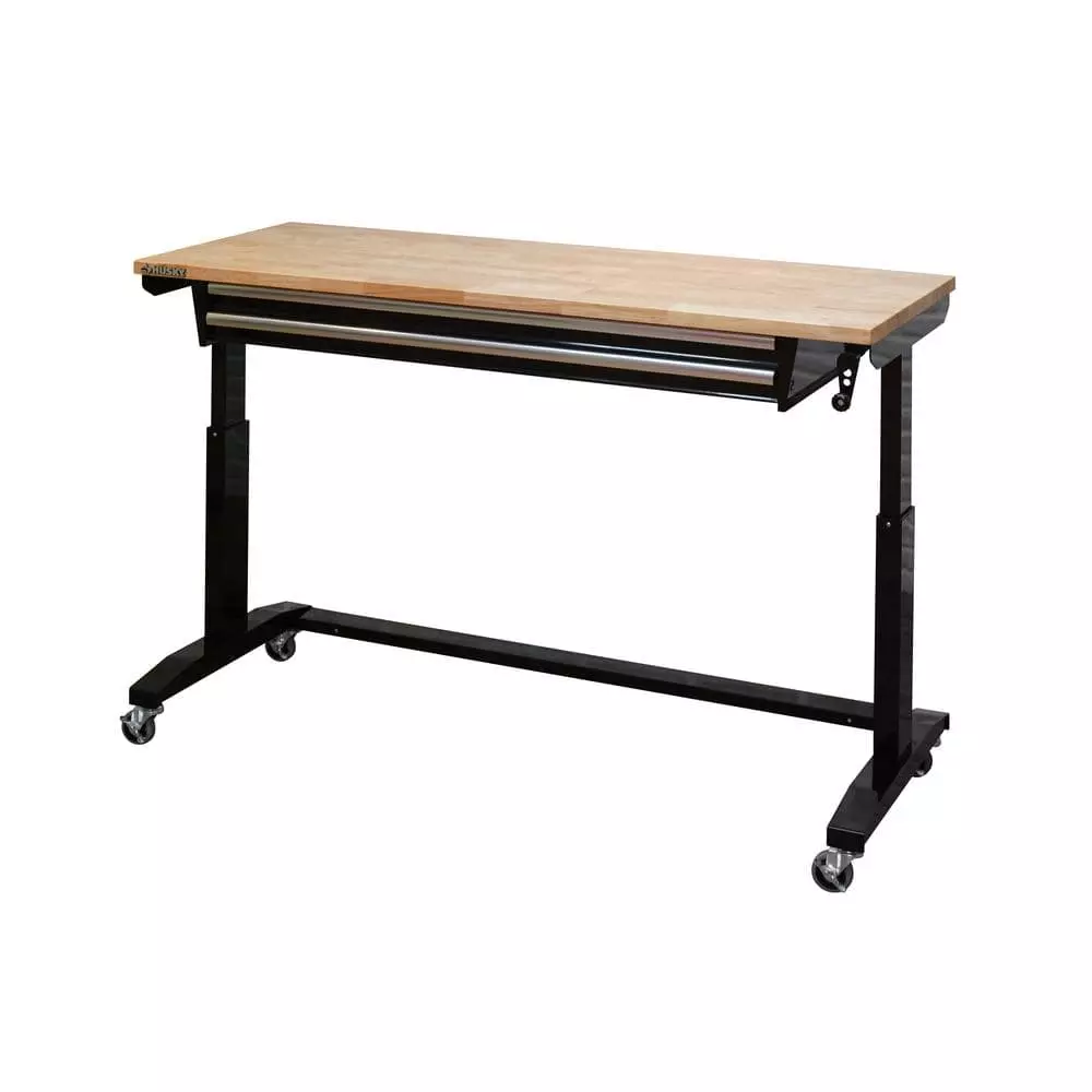 Elevate your work experience with the Husky 62 in. Adjustable-Height Work Table with 2 Drawers. This multi-functional work station features a manual crank that can raise and lower the work surface. The 1.2 in. T, solid wood top is rugged and beautiful and there is plenty of space on the 62 in. W x 24 in. D work surface. The workbench can be assembled with either the four 3 in. x 2 in. polypropylene casters for mobility or attach the 4 leveling feet for use as a stationary table or desk. This work table has plenty of uses around the home, office, hobby room or garage. It is designed with a 300 lbs. weight capacity and an overhang so that you can easily attach your vise grips or cl-Amps while working on a project. This 62 in. Husky Work Table’s contemporary, adjustable-height feature allows you to have the flexibility to sit or stand while working. Research suggests that there are health benefits to alternating between standing and sitting throughout the day because it both decreases body discomfort and increases blood flow. The ergonomic design could also reduce eye and back strain and boost your productivity. The crossbar support can be installed in 2 different locations, depending on your preference. Install the support at the center of the table for an open, 2-sided work area. Or install it along the back of the legs to allow you the versatility of stowing your tool storage and rolling cabinets underneath to further organize your work space.