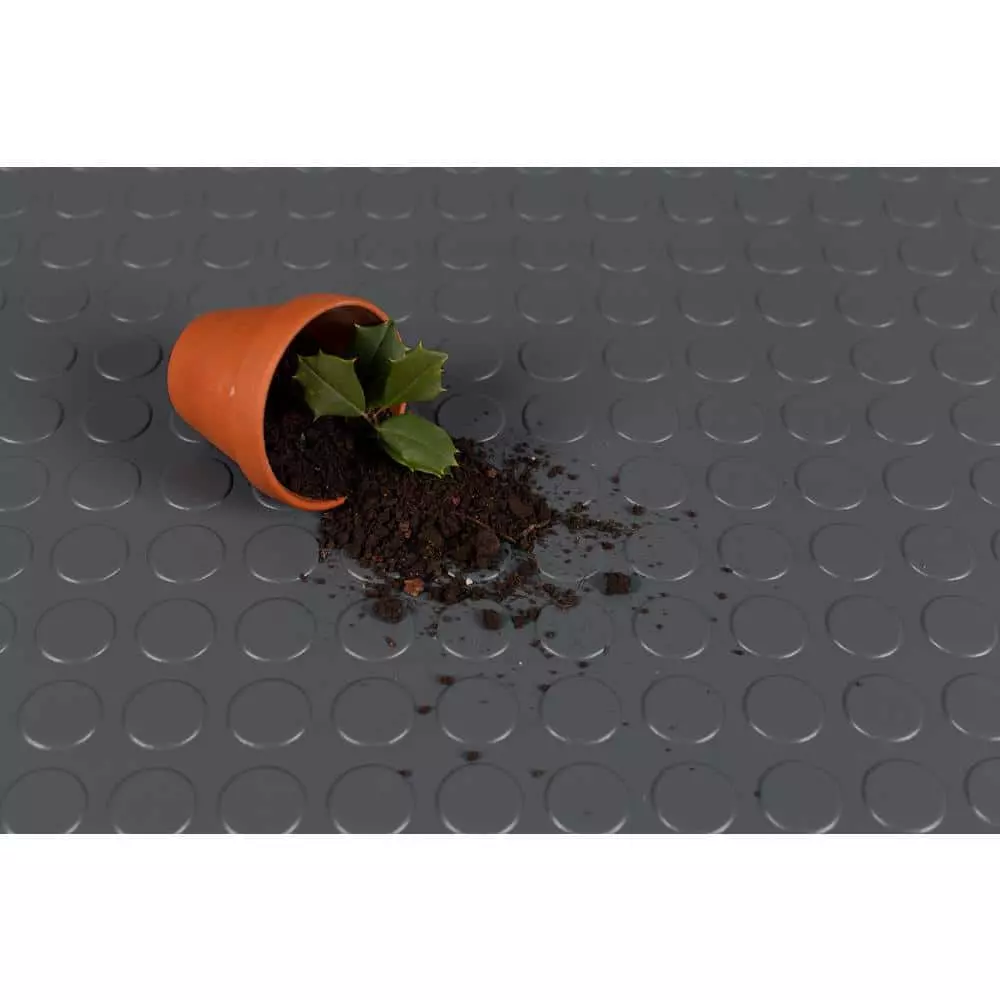 The Husky Coin Universal Flooring is manufactured from tough, specially formulated, solid polyvinyl and has a base thickness of 70 Mil (0.070 in.) and overall thickness of 105 Mil (0.105). This Husky flooring is resistant to most contaminants commonly found in garage and work environments. Helps prevent concrete deterioration, hides cracks and stains, prevents staining on newer floors and creates a moisture barrier. Husky flooring is 100% high quality polyvinyl, not layered with filler material that can crack, split, peel and deteriorate. Perfect DIY flooring. Just roll the product out onto your designated area and enjoy, or for a glue option use an acrylic base vinyl adhesive such as Roberts 2310 or 2315. The Husky flooring can be trimmed to a perfect fit using a straight edge and a utility knife. This product is ten feet wide and you order as many feet long as you need for a custom fit with no waste, up to 100 ft. long in a continuous roll. Orders over 100 ft. will be in 2 or more rolls. Tough enough to be used in the garage, attractive enough to be used everywhere; basements, laundry rooms, trailers, vehicles, schools, stores, workshops, warehouses, exercise rooms, offices and equipment rooms. Use this anywhere you need attractive high quality flooring.