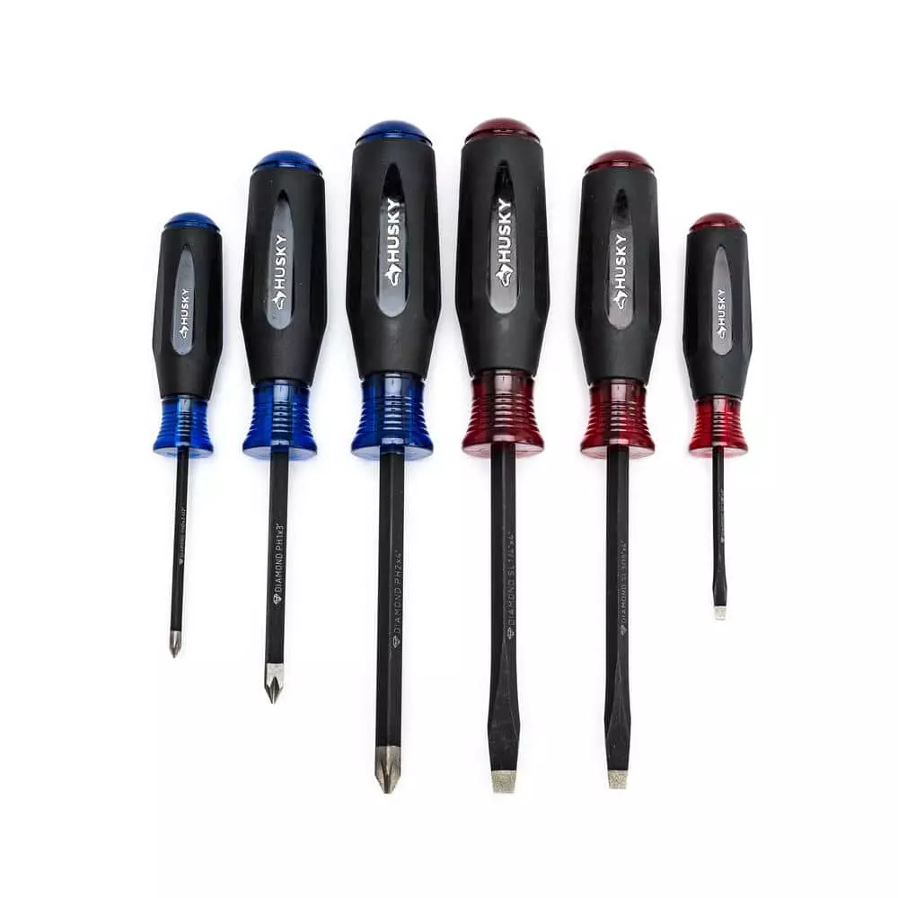 The Husky Diamond Tip Magnetic Screwdriver Set (6-Piece) is designed to provide up to 4-time more grip than a standard screwdriver on slotted and Philips fasteners. Each magnetic screwdriver features a diamond coated tip that is designed to reduce slipping on new fasteners and increased grip on rusted or stripped fasteners. The screwdriver tips are also magnetized to help keep the fastener in place when working in tight access areas. The color-coded dual material handles feature a large size marking stamped into the base of the driver making them easy to identify. With three slotted screwdrivers and three Philips screwdrivers, this magnetic screwdriver set will get the job done.