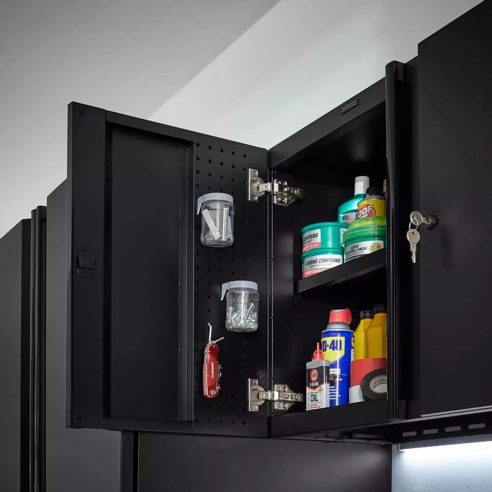 This wall mounted cabinet belongs to The Husky welded garage storage set, it is with well constructed with 20-Gauge steel, a shelf inside, with 3 point mechanic locking system which can secure your stuff. A hanging bracket with bullet-in level which can give perfect support during installation. Also it includes some utility access hole on bottom for some wires going through. Combine this cabinet with other pieces from the Husky heavy-duty Welded Cabinet Collection or other pieces from the Husky family of products for a garage storage solution that’s built to last.