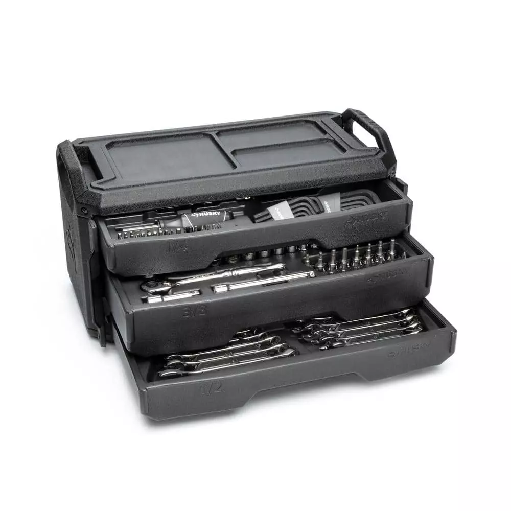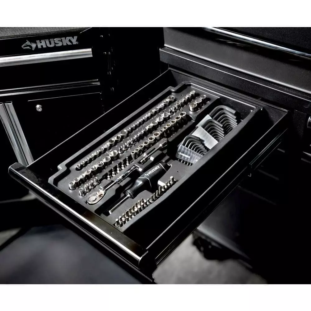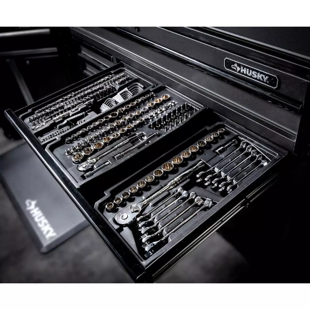 The Husky 235-piece tool set comes-packaged in a tool chest with 3 removable drive-size dedicated drawers for trouble-free transport. The chest holds the drawers securely with dual locking flaps, 1 on each side, and features a 3 compartment small parts tray on the top of the chest to help keep your project organized. This set contains SAE and Metric, standard and deep sockets, bit sockets, dive tools, wrenches, and accessories.