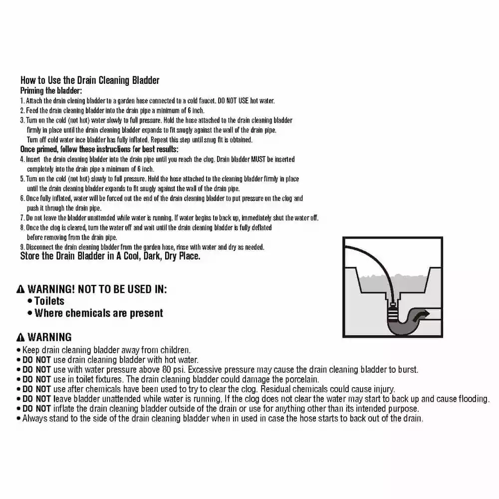 The Husky Medium Drain Bladder helps clear 1.5 in. to 3 in. drains by expanding in the drain and forcing water pressure through the clog. The bladder is designed for use with garden hoses. Features a Lifetime Warranty.