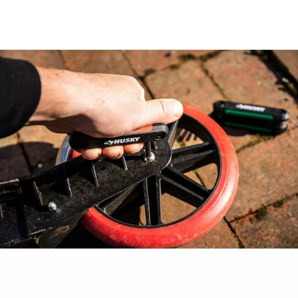 The Husky 17-Piece Mini Precision Folding Hex Key Set features an 9-Piece SAE and 8-Piece Metric alloy steel for strength and durability. The tools have chamfered edges to help guide the tool onto the fastener. The keys also fold up into the holder for easy storage.