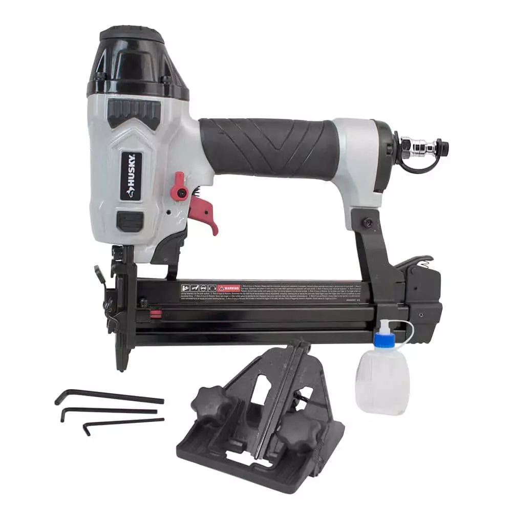 The Husky DPFBC940 Pneumatic 4-in-1 18-Gauge 1-5/8 in. Mini Flooring Nailer and Stapler combines a flooring nailer and stapler with a brad nailer and narrow crown stapler. This exceptionally versatile air powered combo tool is designed to install 3/8 in. to 5/8 in. engineered or solid hardwood flooring with the pre-assembled 45-Degree flooring attachment. Switch out the nose piece fast and easy, and convert this multi-purpose tool into a brad nailer and stapler, allowing you to lay your flooring in hard to reach areas against a wall or in tight corners. You can also then put in base boards, crown moulding, chair rails and other decorative trim. This 4-in-1 nail gun and stapler is compatible with 18 gauge brad nails from 5/8 in. to 1-5/8 in., and 18 gauge 1/4 in. narrow crown staples from 1/2 in. to 1-5/8 in. A one piece drive blade of hardened steel combined with an anodized aluminum cylinder and magazine result in a durable and lightweight tool. The ergonomically engineered body and comfort grip handle make this tool easy to use for long shifts. Featuring a quick jam release, tool-free depth adjust, reload indicator, and an easily adjustable flooring foot plate, this combo tool will increase productivity and reduce unnecessary downtime at the home or job site. The Pneumatic 4-in-1 18-Gauge 1-5/8 in. Mini Flooring Nailer and Stapler will save DIYers and construction contractors time and money, and is covered by Husky’s 2 Year Limited Warranty.