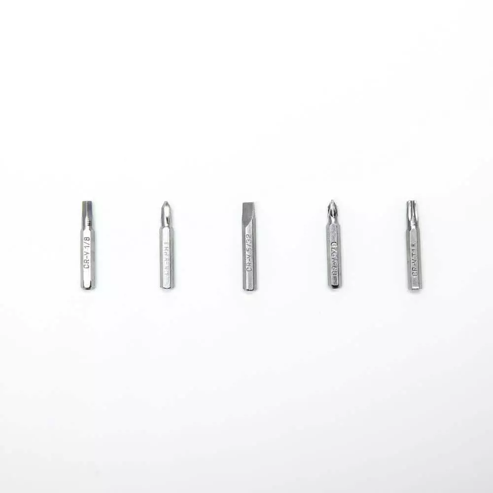 - Set contains 22 bits: (4) Philips: #000, #00, #0, #1, (2) Pozi Drive: #0, #1, (4) slotted: 1/16 in., 3/32 in., 1/8 in., 5/32 in. (8) star bits: T5, T6, T7, T8, T9, T10, T15, T20, (4) Hex: 1/16 in., 3/32 in., 1/8 in., 5/32 in. and (1) ratcheting precision driver handle