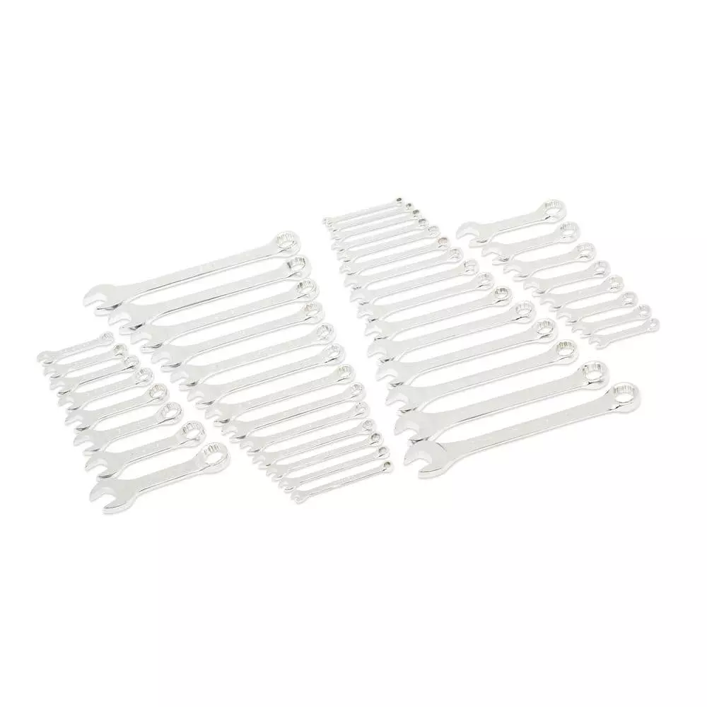 The Husky SAE and Metric Combination Wrench Set includes 28 standard combination wrenches and 16 stubby combination wrenches packed into a convenient rack that doubles as a storage tray. This 44-piece set of Husky regular and stubby length combination wrenches has most sizes (both SAE and Metric) to tackle the fasteners on all your home projects. Husky’s wrenches are forged from Chrome Alloy steel for outstanding durability and strength for a lifetime of use. Combination Wrenches also feature a 12-point box-end with a 15° offset for increased clearance. Each wrench has large, hard-stamped size markings which allow for easy identification. A chrome finish easily wipes clean of oil and dirt plus corrosion resistance. The storage rack has clear size markings and a built-in handle that makes transporting your wrenches from one task to another easy and simple. No matter if you are a professional mechanic or a DIY-er, this set of wrenches is perfect for your garage or home workshop.
