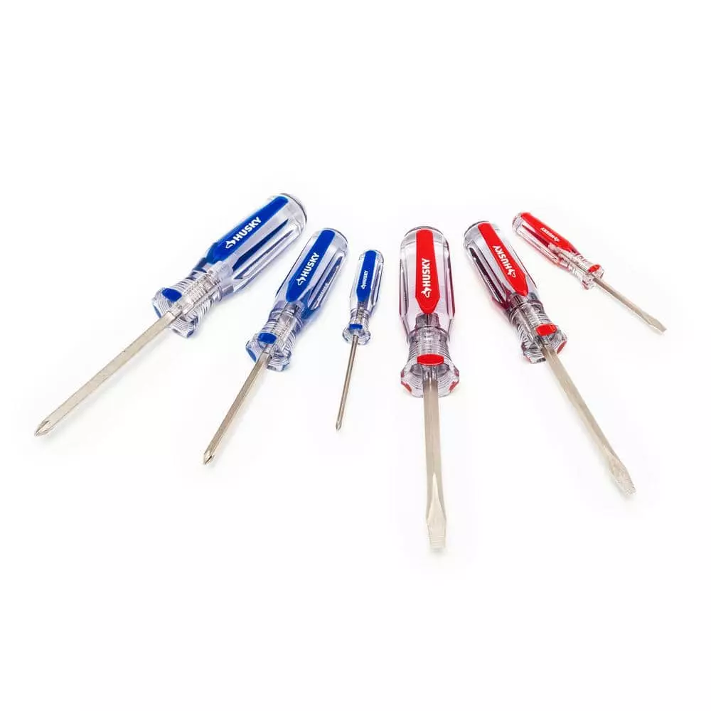 This Variety Screwdriver Set from Husky includes 3 slotted head and 3 Phillips head screwdrivers. Each blade is forged from high strength alloy steel for added strength. The non-slip ergonomic handles are resistant to impact and chemicals.